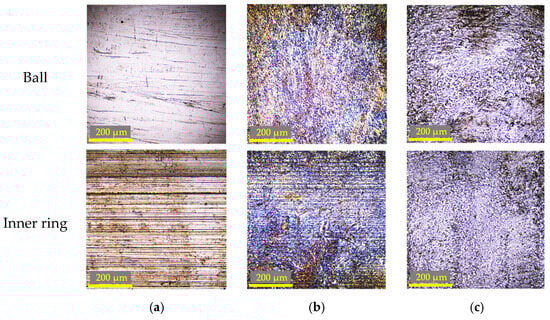 In the normal stage (Figure 5a), distinct machining marks aligned parallel to the rolling direction were observed, and the overall surface exhibited a relatively uniform machining morphology. In contrast, in the damaged stage, the directional nature of the wear tracks became less pronounced, and non-uniform wear and surface roughening became dominant. Under the 197.5 N load condition (Figure 5b), locally glossy regions were observed on the surface, suggesting the contribution of severe wear accompanied by localized adhesion and shear. In addition, the presence of dark wear debris indicates that abrasive wear caused by entrapped wear particles may have begun to occur. Under the 395 N load condition (Figure 5c), surface roughening became more pronounced, suggesting that abrasive wear mediated by wear debris became more dominant. Furthermore, blackened regions were observed, indicating the occurrence of scuffing or seizure accompanied by localized temperature rise.