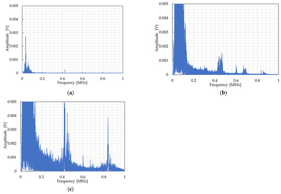 Figure 6 shows the FFT analysis results of AE signals in the normal stage (Figure 6a) and the damaged stage (197.5 N: Figure 6b; 395 N: Figure 6c). In the normal stage, a dominant peak was observed near 0.034 MHz, while high-frequency components were relatively small. In the damaged stage, the dominant peak near 0.034 MHz remained, whereas multiple new peaks appeared in the higher-frequency region. Under the 197.5 N condition, peaks were observed near 0.45 MHz, 0.6 MHz, 0.68 MHz, and 0.84 MHz, indicating diversification of frequency components associated with damage progression. Under the 395 N condition, peaks near 0.45 MHz and 0.84 MHz became particularly pronounced, demonstrating a marked increase in high-frequency components.