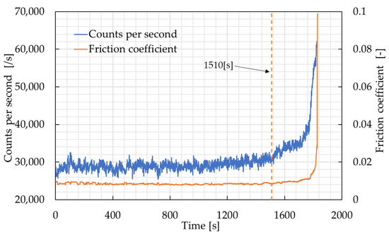 Figure 7 shows the time evolution of counts per second and the friction coefficient under the 197.5 N load condition. During the early stage of the test, the counts per second remained within the range of approximately 2.5 × 104 to 3.2 × 104 s−1, with no clear trend. However, around 1510 s—corresponding to the onset of friction coefficient increase—the counts per second began to increase gradually. As damage progressed, the rate of increase accelerated, and in the final stage of the test, the counts per second rapidly increased to values exceeding 6.2 × 104 s−1. Thus, the counts per second exhibited changes in the same time window as the initial rise in the friction coefficient, suggesting that this parameter is effective for early damage detection.