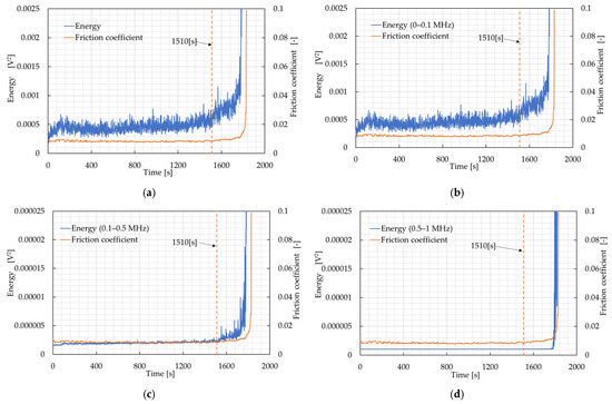 Figure 8 shows the time histories of the coefficient of friction and the band-specific AE energy under a radial load condition of 197.5 N. Figure 8a–d present the simultaneous variations in AE energy and the coefficient of friction in the total frequency band (0–1 MHz), the low-frequency band (0–0.1 MHz), the middle-frequency band (0.1–0.5 MHz), and the high-frequency band (0.5–1 MHz), respectively.