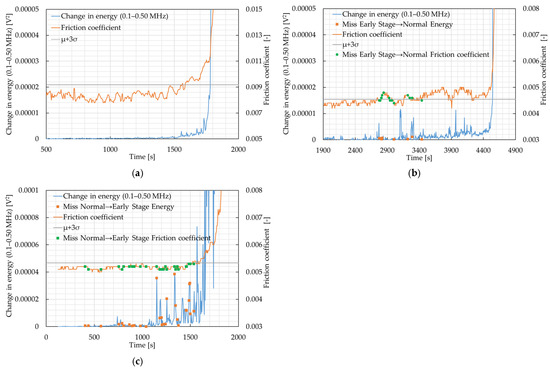 Figure 9 presents, among the bearing life test results, a sample with no misclassification (Figure 9a) and two samples with frequent misclassification: (i) a sample in which early stage of damage was often misclassified as normal (Figure 9b), and (ii) a sample in which normal was often misclassified as early stage of damage (Figure 9c). For each sample, the time histories of the friction coefficient and the variation in AE energy (0.1–0.5 MHz) are shown together with the time points where misclassification occurred.