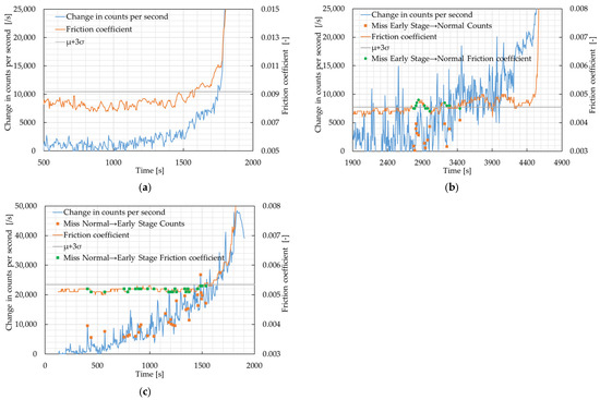 Temporal variations in AE counts per second and friction coefficient for samples associated with misclassification: (a) sample without misclassification; (b) sample with frequent misclassification from early-stage damage to normal; (c) sample with frequent misclassification from normal to early-stage damage.
