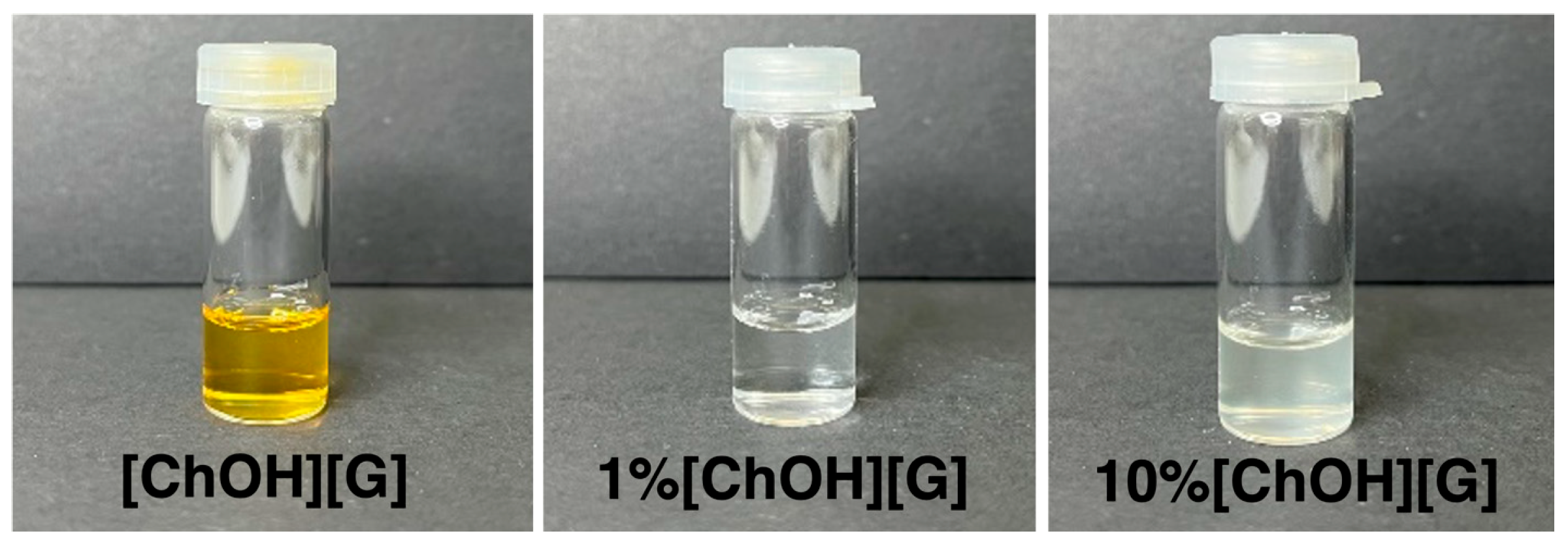 3.1. Characterization of the Novel DES: Choline Hydroxide–Glycerol