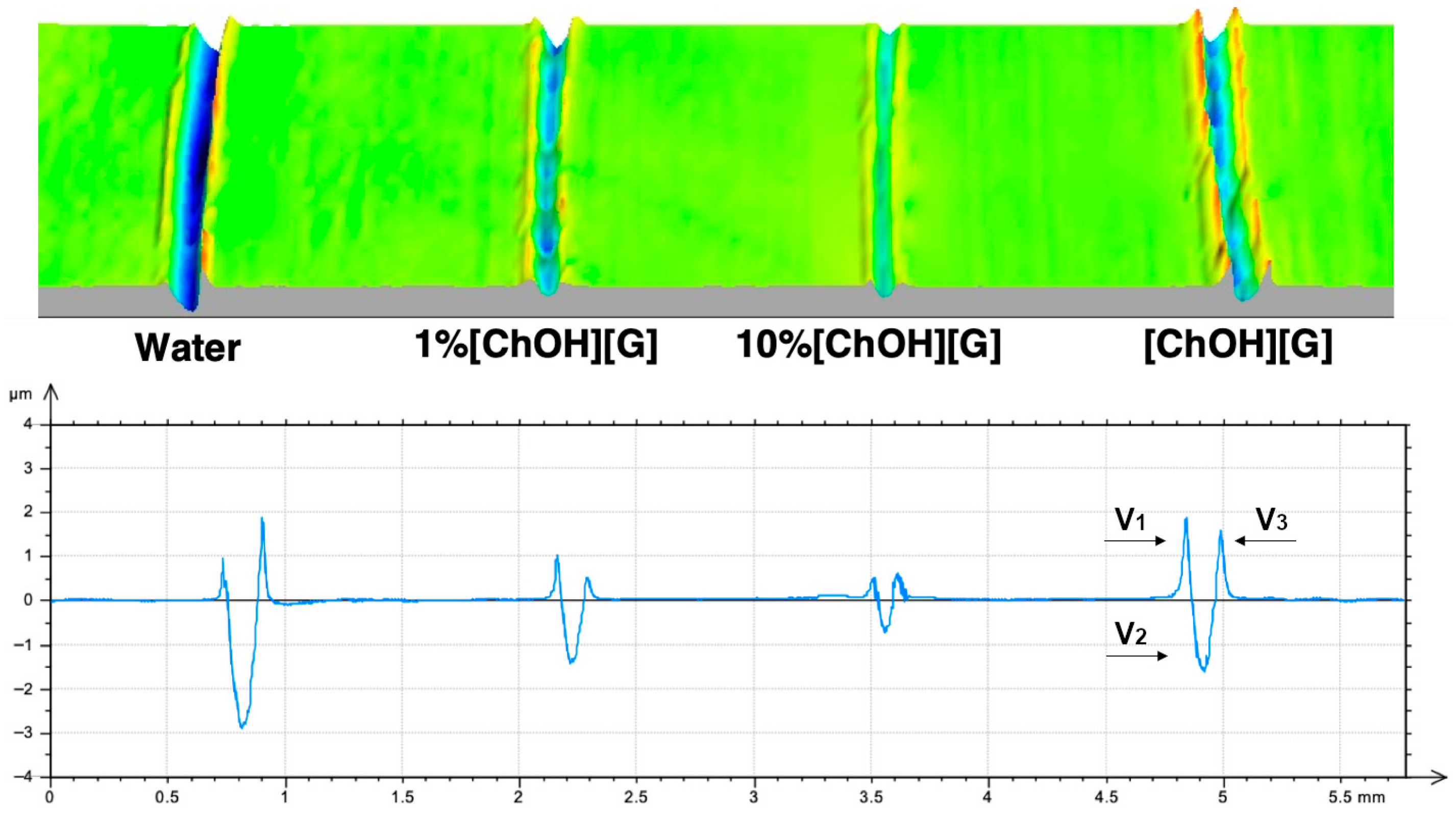 | 1% [ChOH][G] | ![]() 66.4° (±3.6) | ![]() 52.6° (±1.0) |