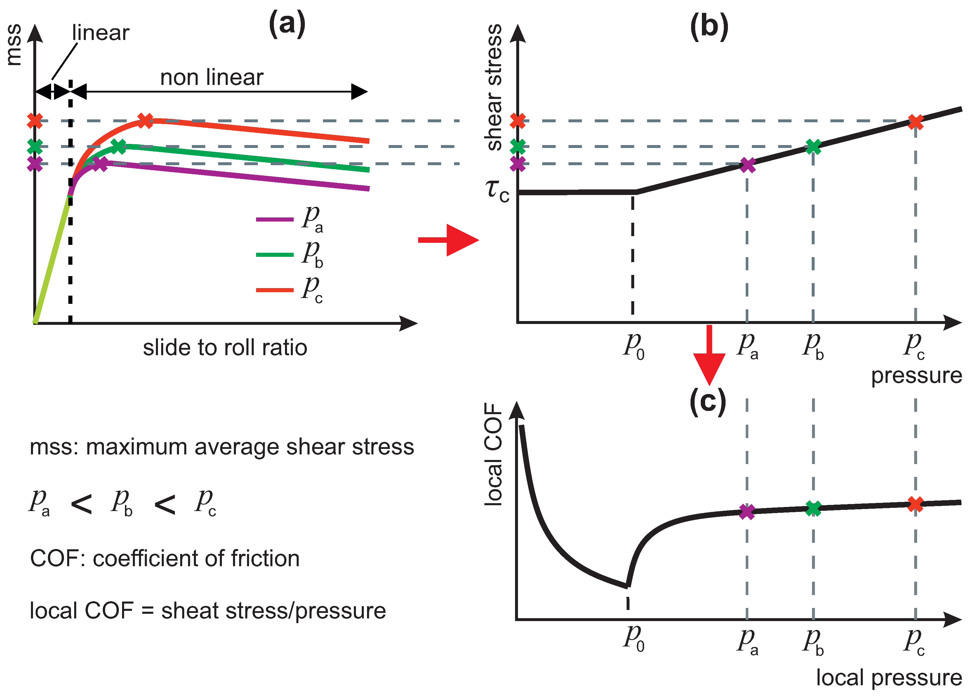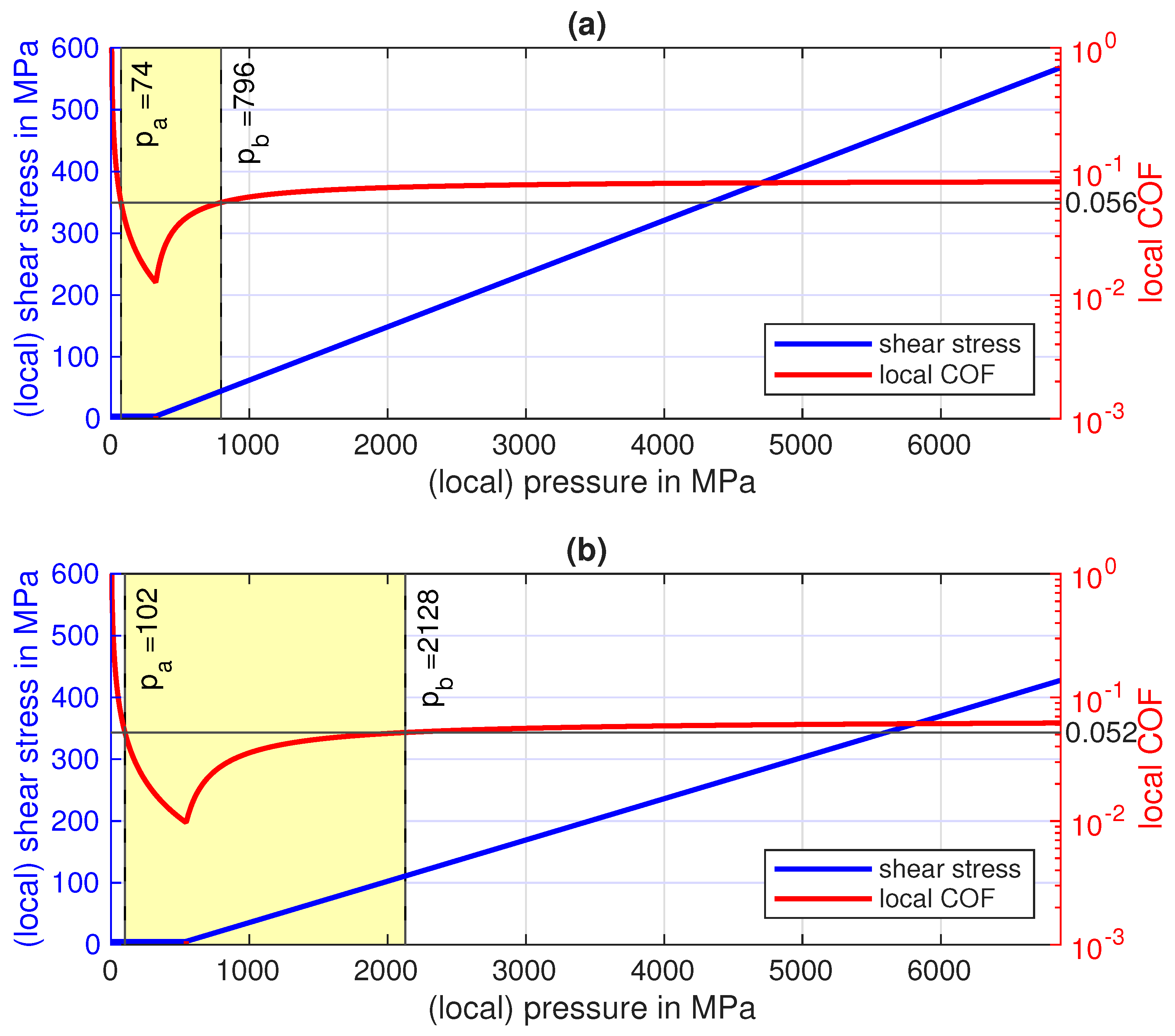 It should also be noted that the bilinear limiting shear stress approach based on an experimentally determined relationship between maximum average shear stress and average contact pressure, assuming that it directly represents the local limiting shear stress as a function of local contact pressure, is a simplification; it ignores the fact that the limiting shear stress will never be reached at all contacts within the contact area. In reality, the percentage of contacts where the local limiting shear stress is active rises with increasing normal load. Frictional heating, which rises with sliding speed, will also affect local shear stresses, especially through a transition to solid body friction caused by direct metal-to-metal contact. Furthermore, assuming the critical shear stress to act at low contact stresses is a simplifying approach. All these effects and points of concern will be addressed in more detail in a subsequent paper. One approach to address this could be the determination of the true LSS instead of the MSS using dedicated approaches such as the method proposed by Bair [