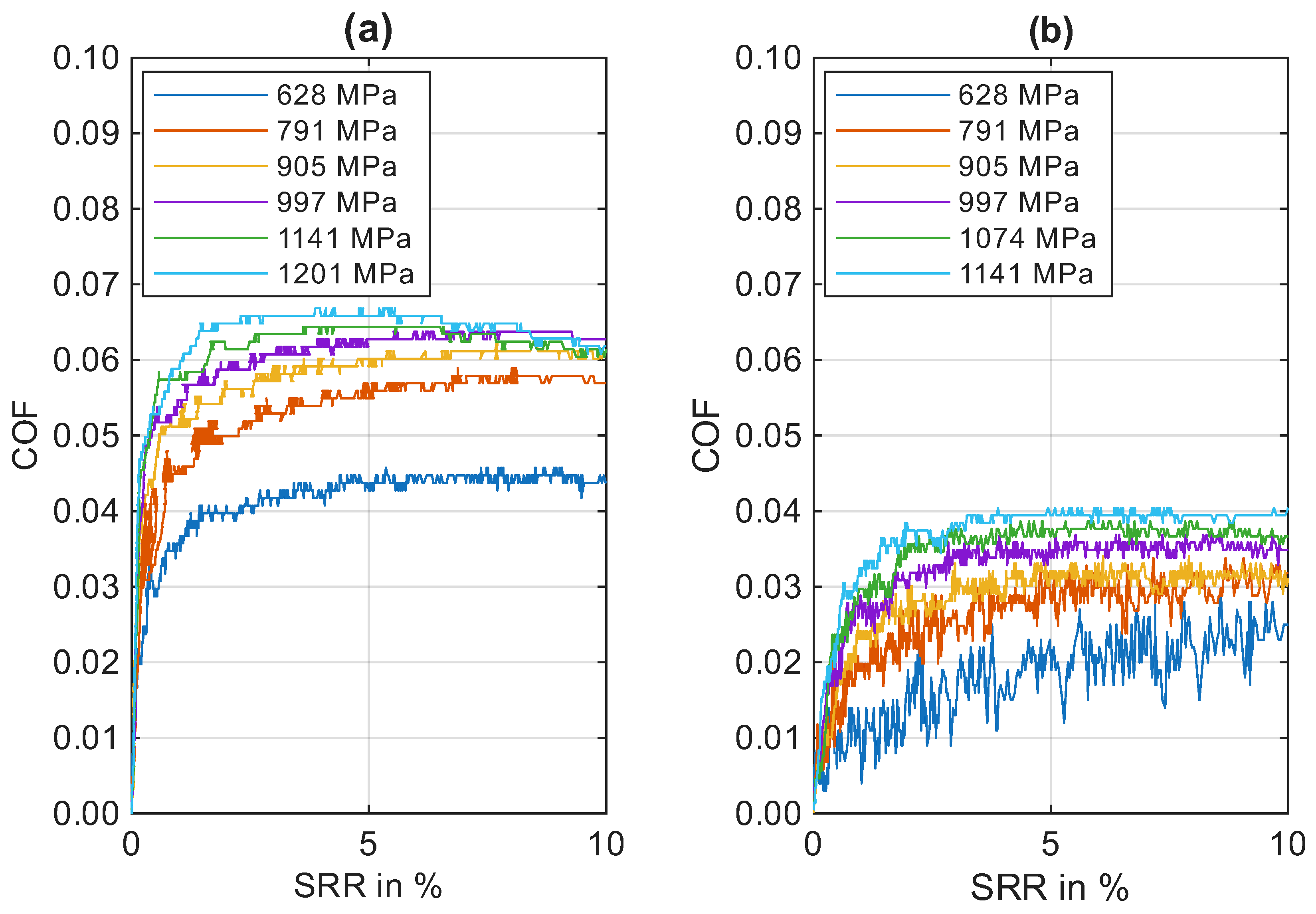 The limitations mentioned above were successfully mitigated by introducing a higher COF (0.12) for the most heavily loaded asperities. This approach is based on the assumption that, for these asperities, friction is no longer governed by the limiting shear stress, as their boundary layers are in direct contact. Although the exact mechanism underlying this behavior is not yet fully understood, it is assumed to result either from lubricant film breakdown or from the squeeze-out of the initially pressurized lubricant cushion caused by temperature-induced shear thinning during sliding. Although the chosen value 0.12 yields acceptable results within the scope of this study, its generalization requires further investigation. One possible approach would be the detailed characterization of the surface layers, for example, by XPS or ToF-SIMS analysis. In this context, it is important to note that 0.12 was obtained through calibration based on experimental data acquired with the mineral oil (MIN) and is therefore only valid for the specific case of two steel bodies lubricated with additive-free base oil. Indeed, the boundary layer COF depends on the material pairing, which in this study corresponds to that of a (lubricated) steel–steel contact. If additives that alter the surface layers of the contacting bodies are present, a different value than 0.12 would need to be considered. In addition, each oil probably requires individual calibration of the COF, since each oil exhibits distinct shear-thinning and film breakdown behavior.