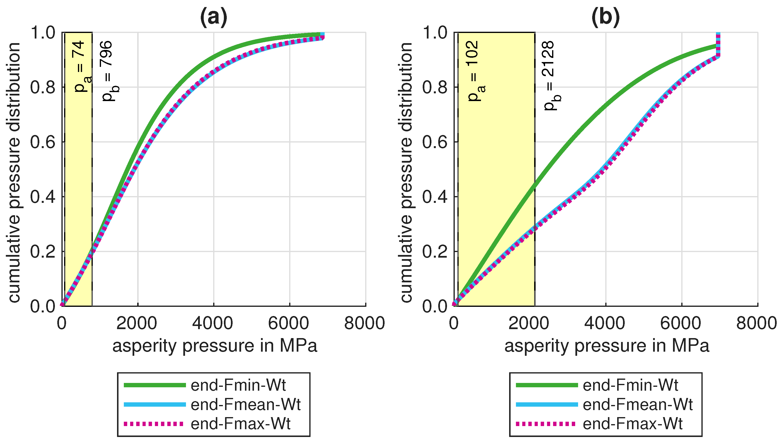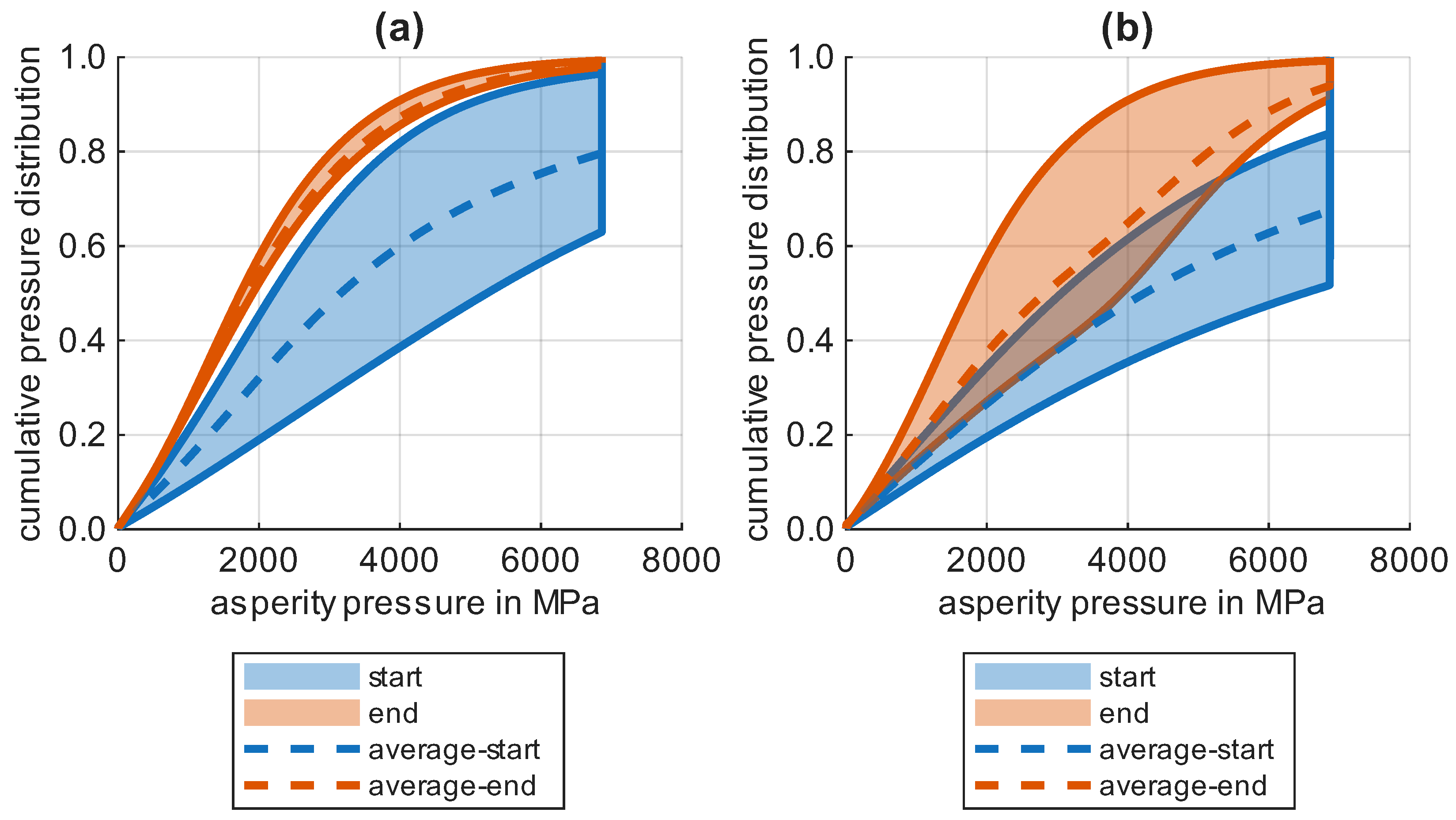The original model also demonstrated a limited sensitivity to changes in surface topography due to wear. Experimentally, substantial wear and surface smoothing resulted in a pronounced decrease in the COF, but the simulation predicted only a minor reduction. This insensitivity can be traced to the narrow pressure window in which the model predicts lower friction than the end-of-experiment experimental values, as shown by the analysis of local pressure distributions and cumulative probability plots. These findings highlight the need to refine the model’s description of surface evolution and its coupling to friction, potentially by adopting more advanced approaches to roughness characterization that distinguish between different morphological features such as ridges and grooves.