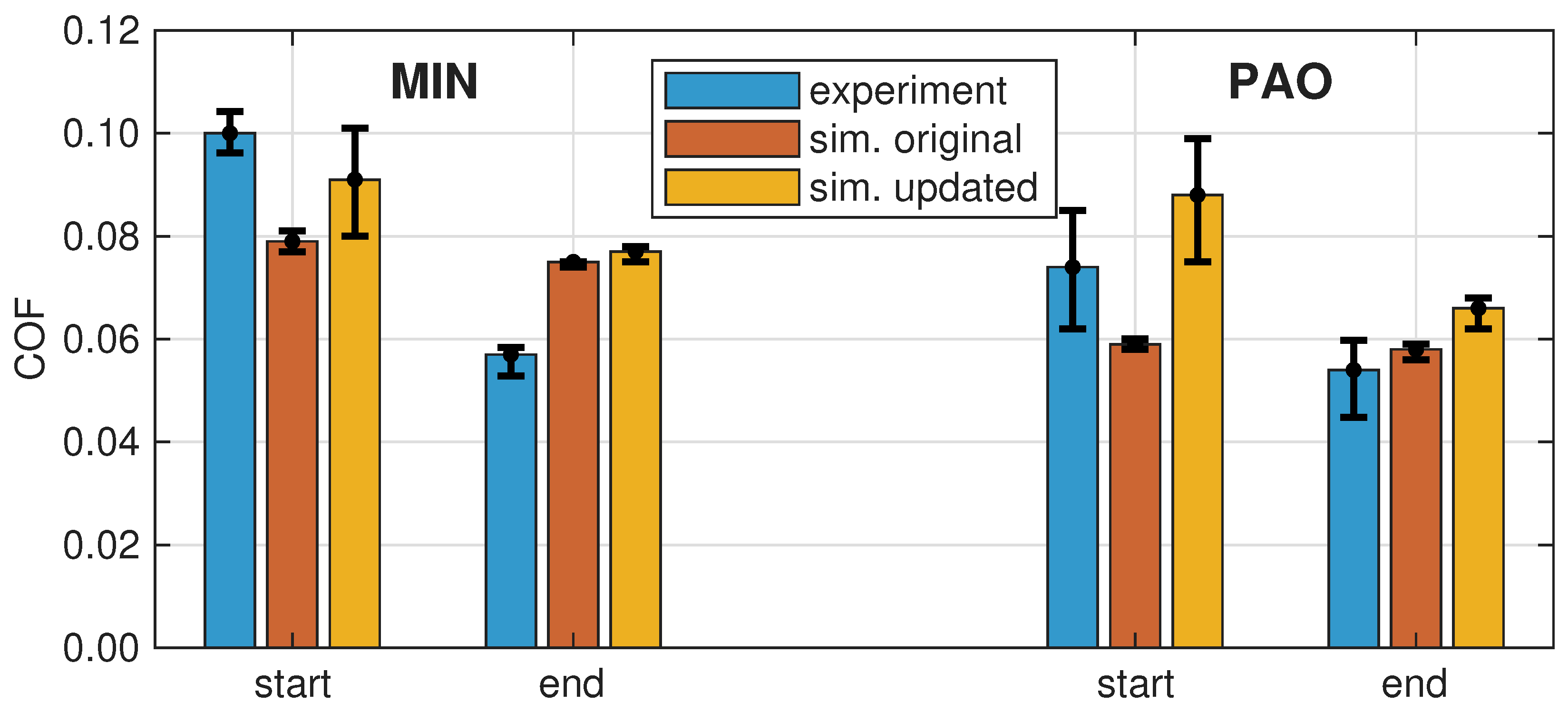 An original model was first developed and then updated. The original model was able to distinguish between the two lubricants, reflecting their differing frictional behaviors in the simulation results. Furthermore, the inclusion of actual surface profiles (see