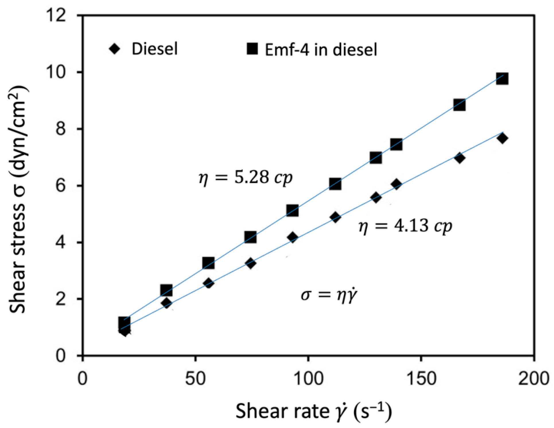 The emulsifier–diesel solution of Emf-4 shows a negligible shear thinning effect, i.e., the solution maintains a linear relationship of