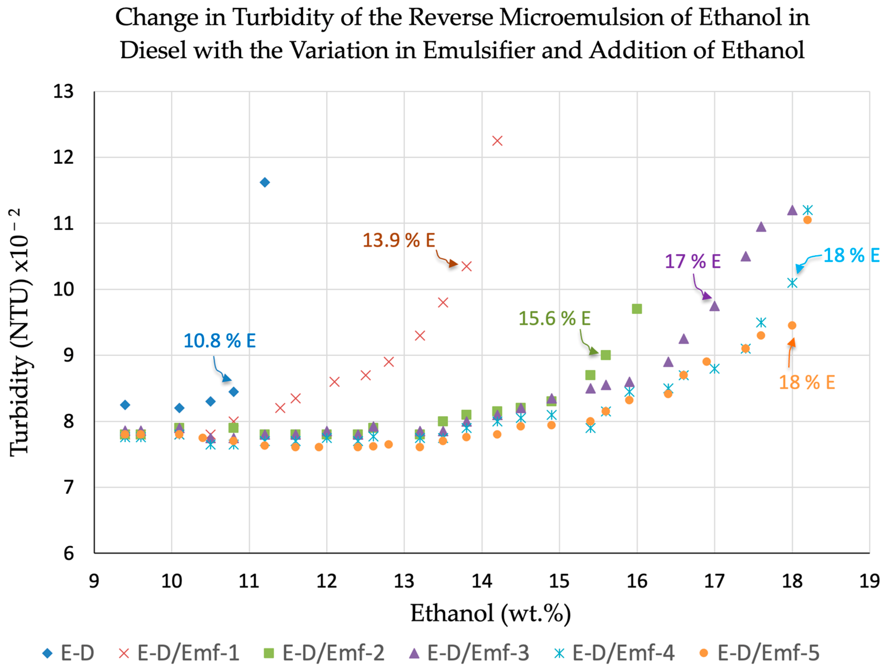 In this examination, the initial turbidity is that of the diesel solution (5 wt.% Emf-i); then, the turbidity underwent continuous and minor increases with the addition of alcohol portion by portion until an obvious leap in turbidity (≥70 NTU). This point is taken as the incipient phase instability, though the emulsion still retains adequate clarity at this ethanol content. Hence, the limit of ethanol for this microemulsion is defined as the alcohol content (in wt.%) right before the point showing initial instability.
