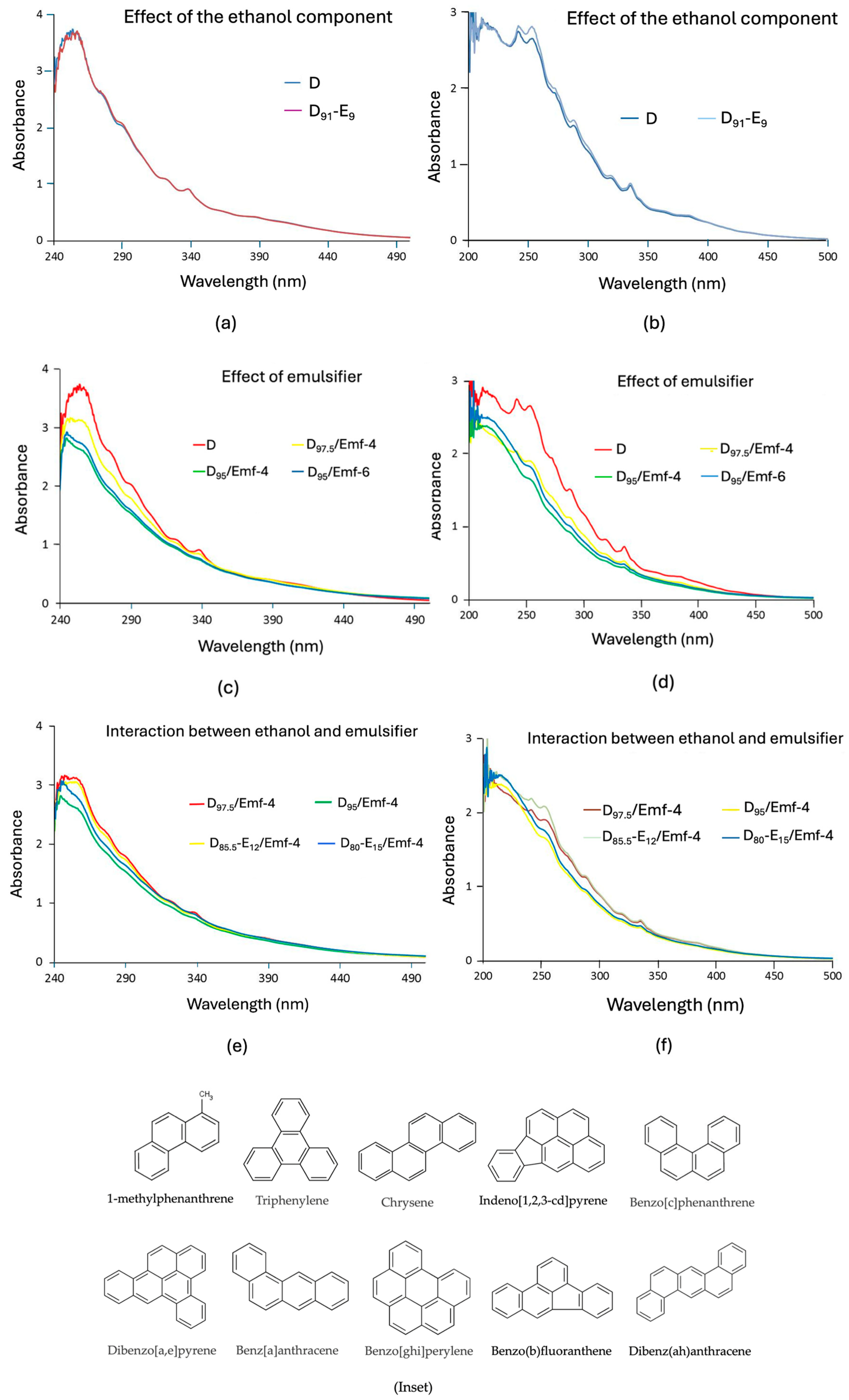12-soluble PAHs (6f), although the effect is relatively complex, two wavelength regions allow a clearer interpretation. In the absence of ethanol, fewer PAHs absorbing shorter-wavelength UV light (<240 nm) are present compared with the two E-Diesels counterparts. Meanwhile, irrespective of whether ethanol is present, a higher Emf-4 content (5%) results in fewer PAHs absorbing longer-wavelength UV light (>240 nm) than a lower Emf-4 content (2.5%). In summary, the presence of an emulsifier in both diesel solutions and E-Diesels reduces the formation of the total (CHCl