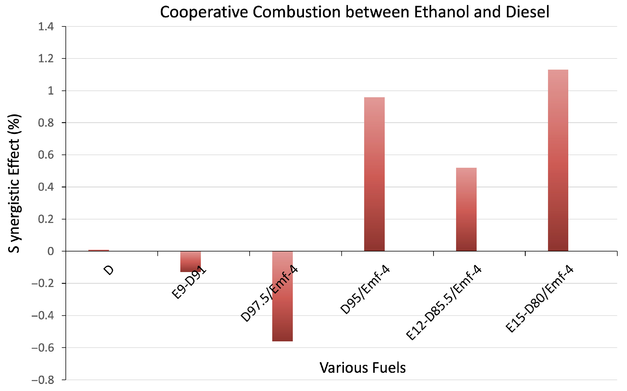 The formation of Emf-4 reverse micelles in diesel promotes a synergistic combustion effect. This effect is further enhanced by ethanol in the Emf-4-stabilized microemulsion, owing to the highly dispersed state of ethanol droplets and their intrinsic oxygen content.
