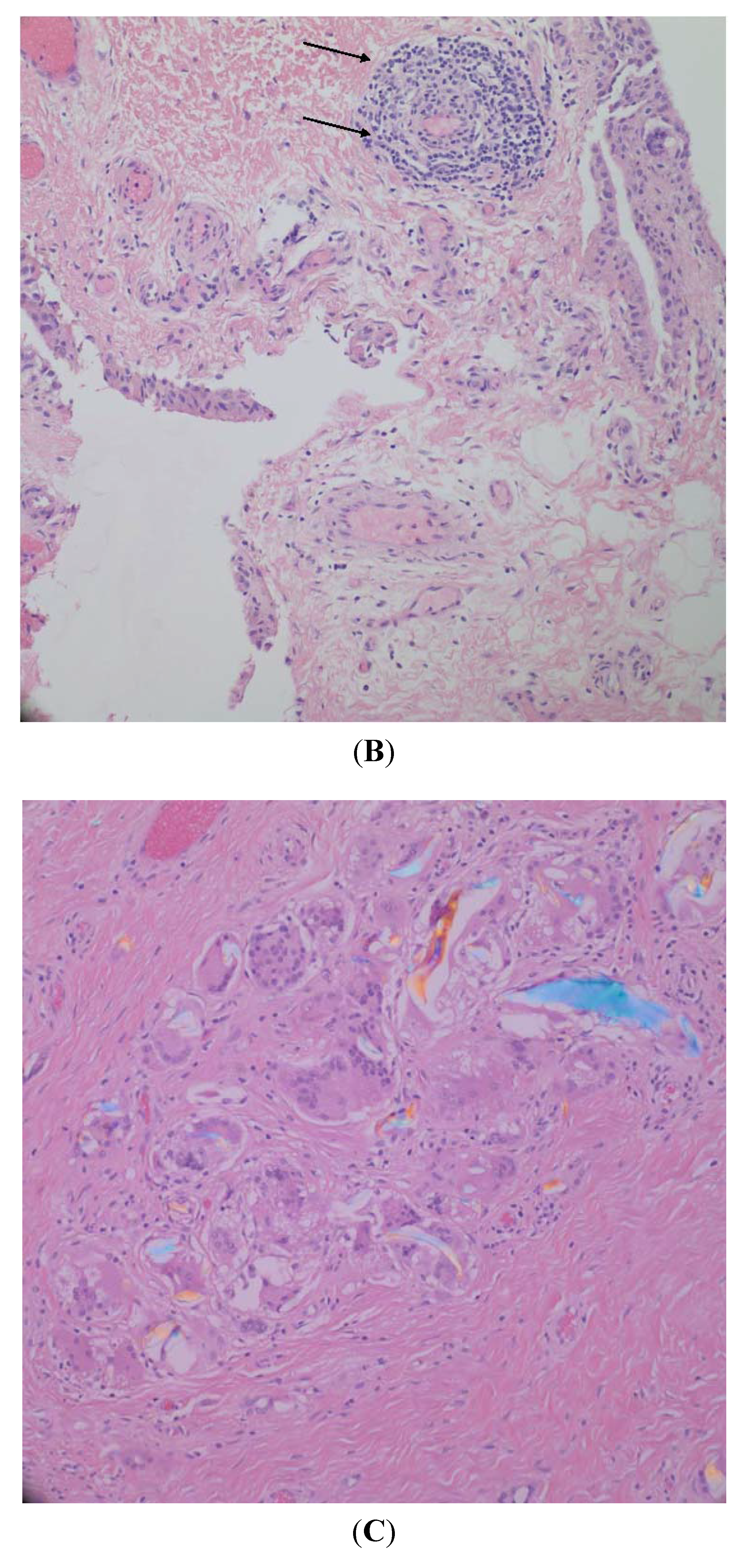 Figure 3 shows light micrographs of synovial tissue from an osteoarthritic joint prior to metal-on-polyethylene joint replacement (Figure 3A) and then following revision of that joint replacement (Figure 3B) in the same patient. Microscopic examination of both pre- and post-revision specimens in this patient shows an intimal/synovial lining with an underlying, non-specific, lymphoplasmacytic, chronic inflammatory infiltrate adjacent to, or centered around blood vessels. The post-revision specimen displays a denser collagenous subintimal layer (Figure 3B). Also present in the post-revision tissues are fragments of polarizable polyethylene with accompanying chronic inflammation including foreign body giant cells (Figure 3C).