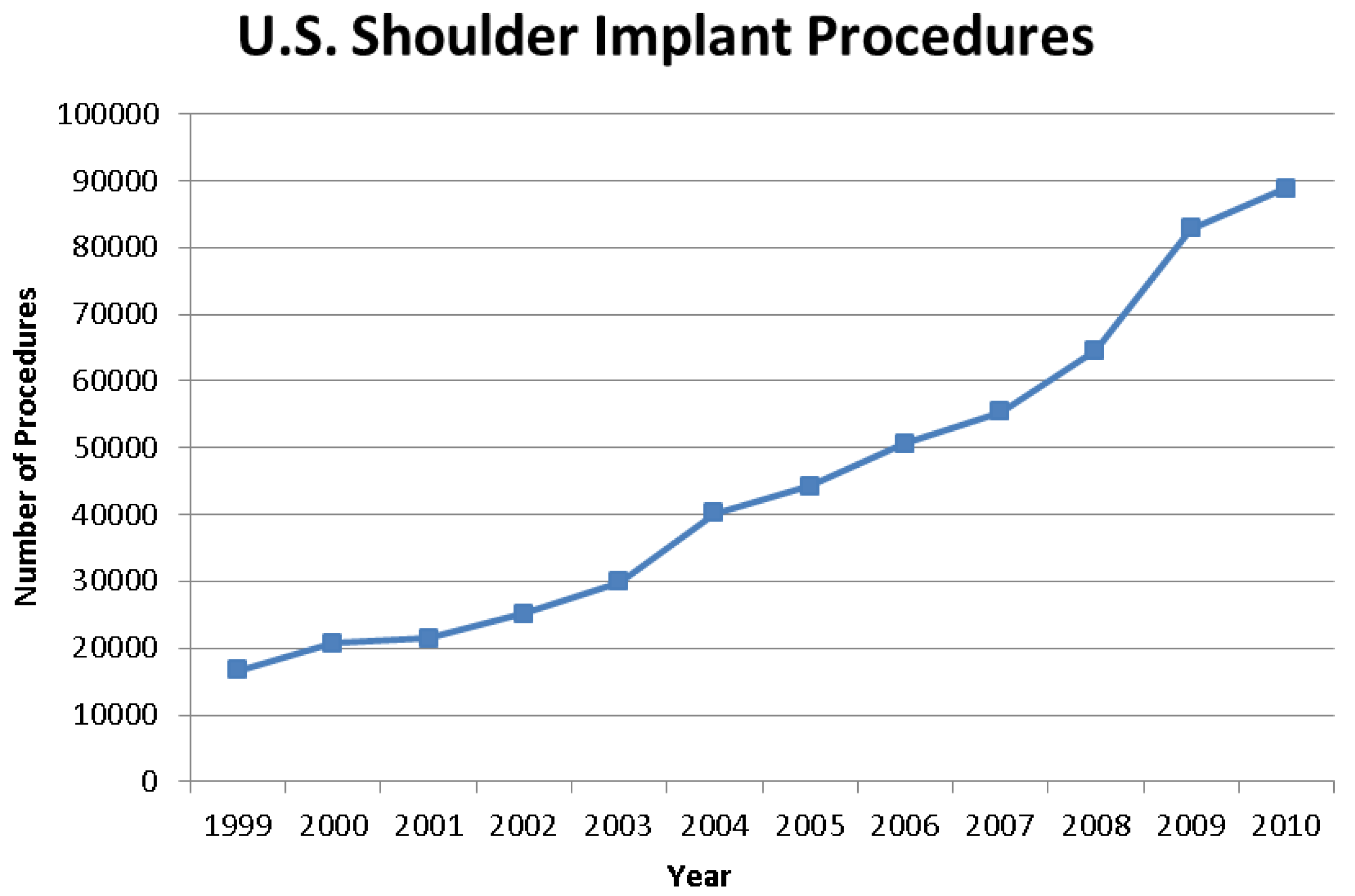 Graph showing the continual increase in shoulder implant procedures from 1999 to 2010 [1].