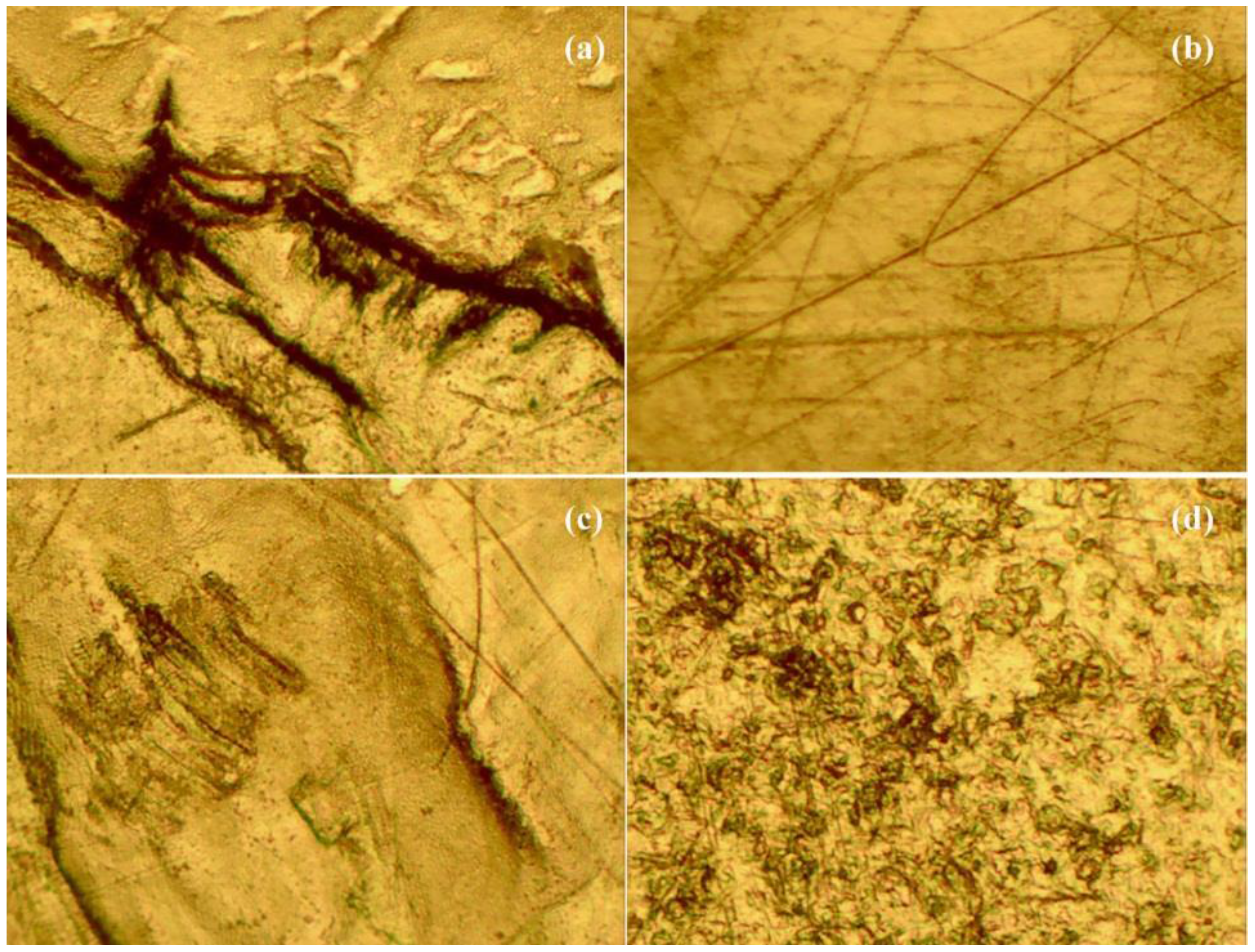(a) Shows severe grooving at 10× magnification; (b) shows burnishing in addition to severe scratching at 10× magnification; (c) shows third-body wear in addition to scratching and burnishing at 10× magnification; (d) shows pitting at 10× magnification.