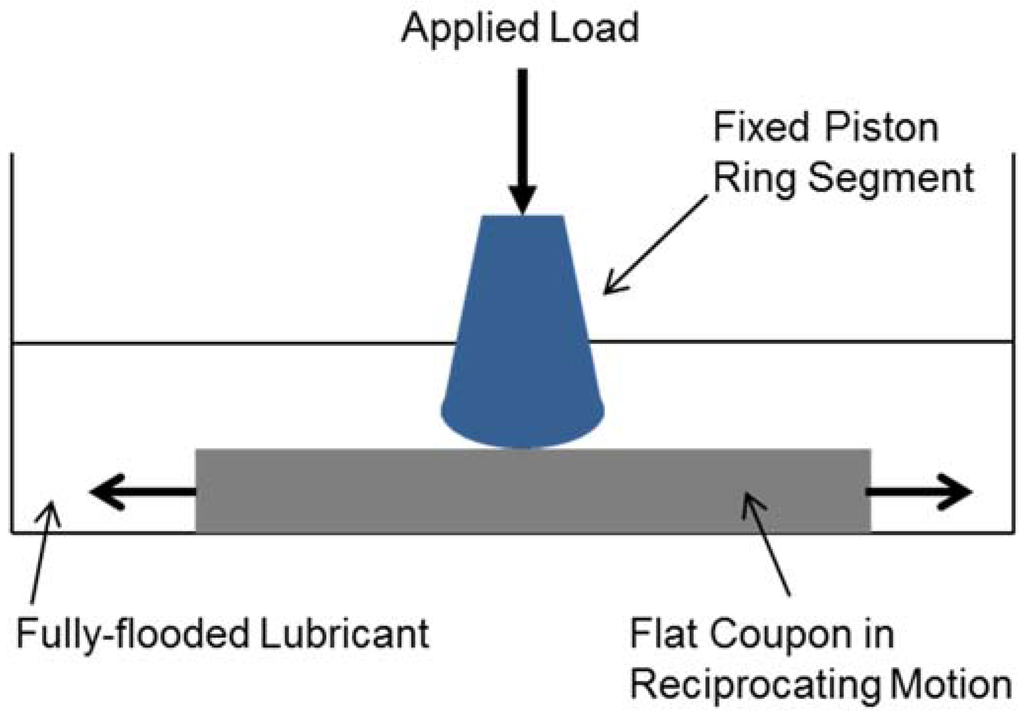 Tribological tests were conducted using a High Frequency reciprocating tribometer (Plint TE77). Figure 1 shows the schematic of the test configuration using a piston ring segment and a flat coupon under lubricated conditions. Table 2 shows the test conditions used for each tribo-test. Contact pressure was calculated using the Hertz theory for non-conformal contacts, as mentioned in Reference [13]. Electrical contact resistance (ECR) was measured to understand the boundary film formation process using the Lunn-Furey ECR Circuit [14]. Each test was repeated three times and mean of friction coefficient and wear volume data were reported.