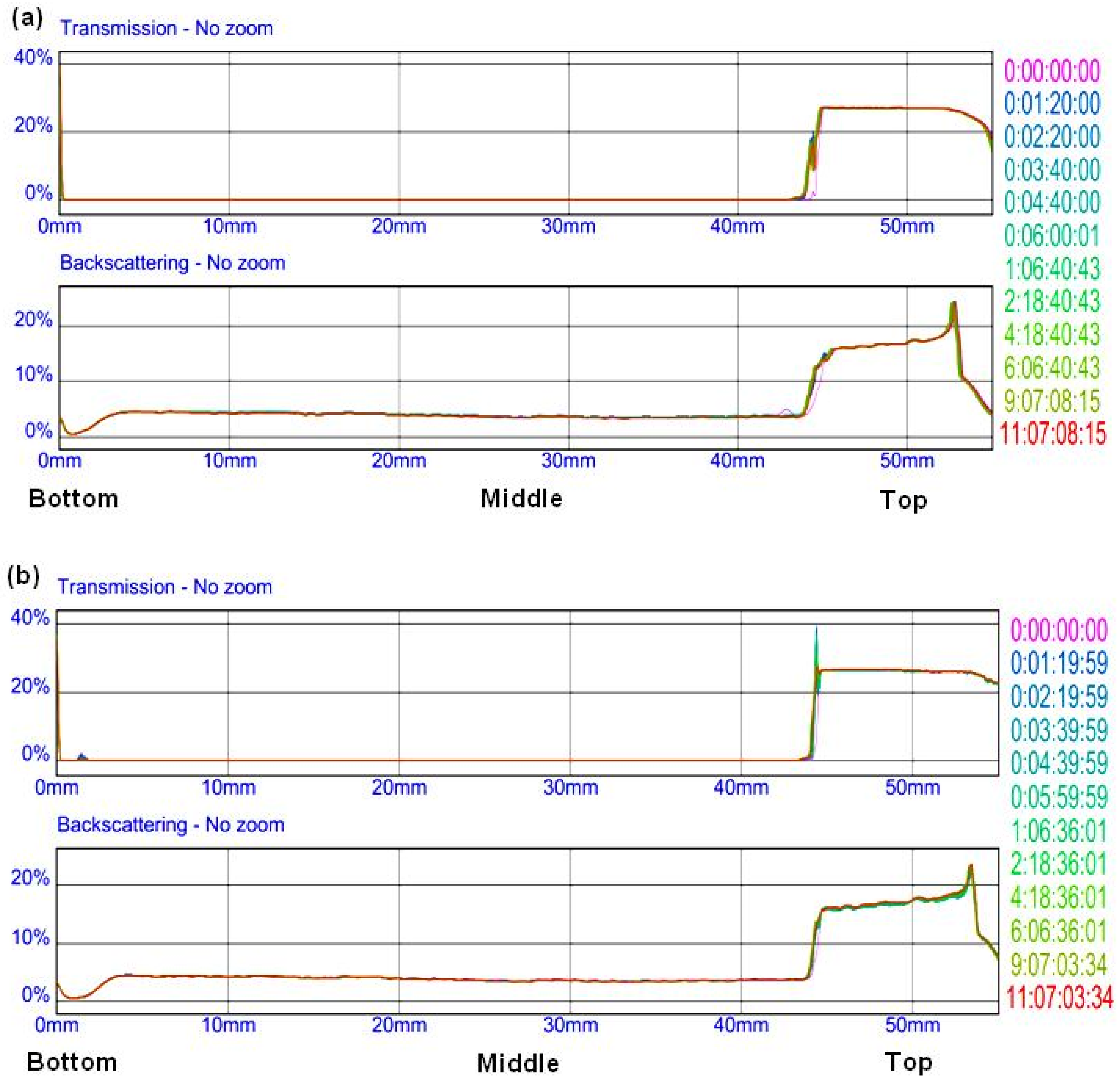 Stability analysis spectra of 6% IL1 (a); and 6% IL2 (b) in Used Oil. The horizontal axis corresponds to height of oil sample (45 mm) in bottle and color of different profiles corresponds to time scale (day:h:min:s) on vertical axis on the right.