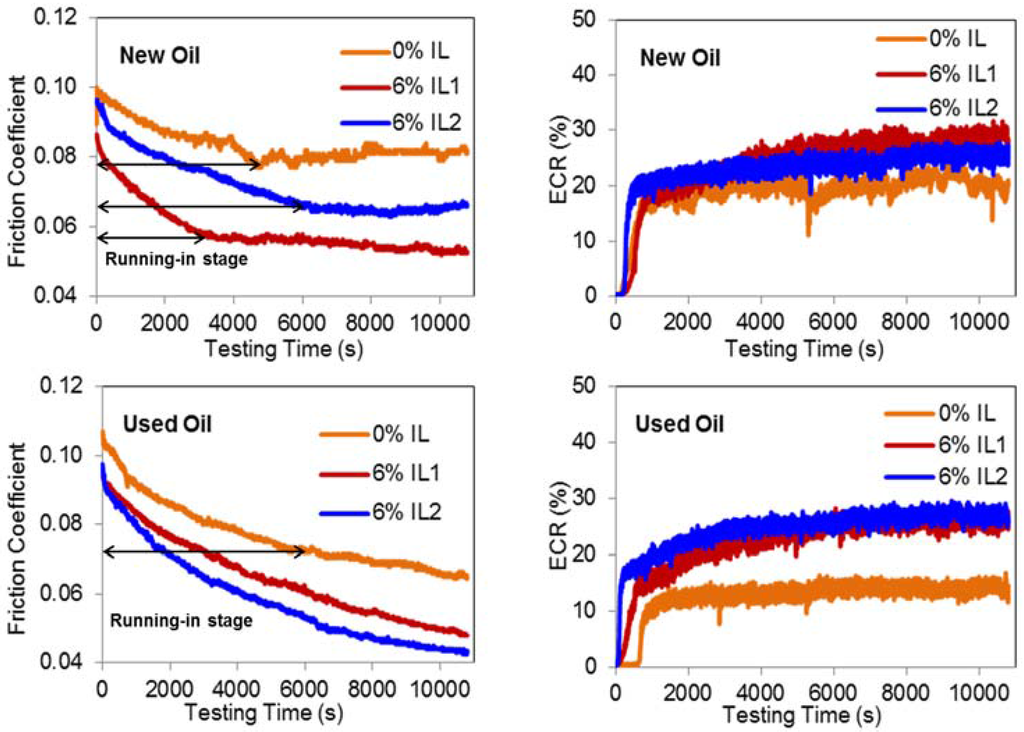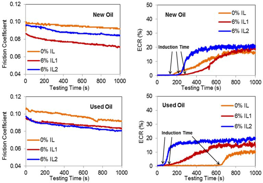 A quantitative comparison of boundary film formation behavior of oils, with and without ILs, was made using ECR curves based on the theory proposed by Yamaguchi et al. [24]. According to their theory, at the beginning of sliding, chemical changes may be occurring that result in surface species beginning to form, and, with continued sliding, a sufficient accumulation of such species results in rapid boundary film formation. The time interval between the start of sliding and the start of film formation is defined as the induction time. A clear difference in the induction time after the addition of ILs to the New and Used Oil can be seen in the ECR results shown in Figure 4.