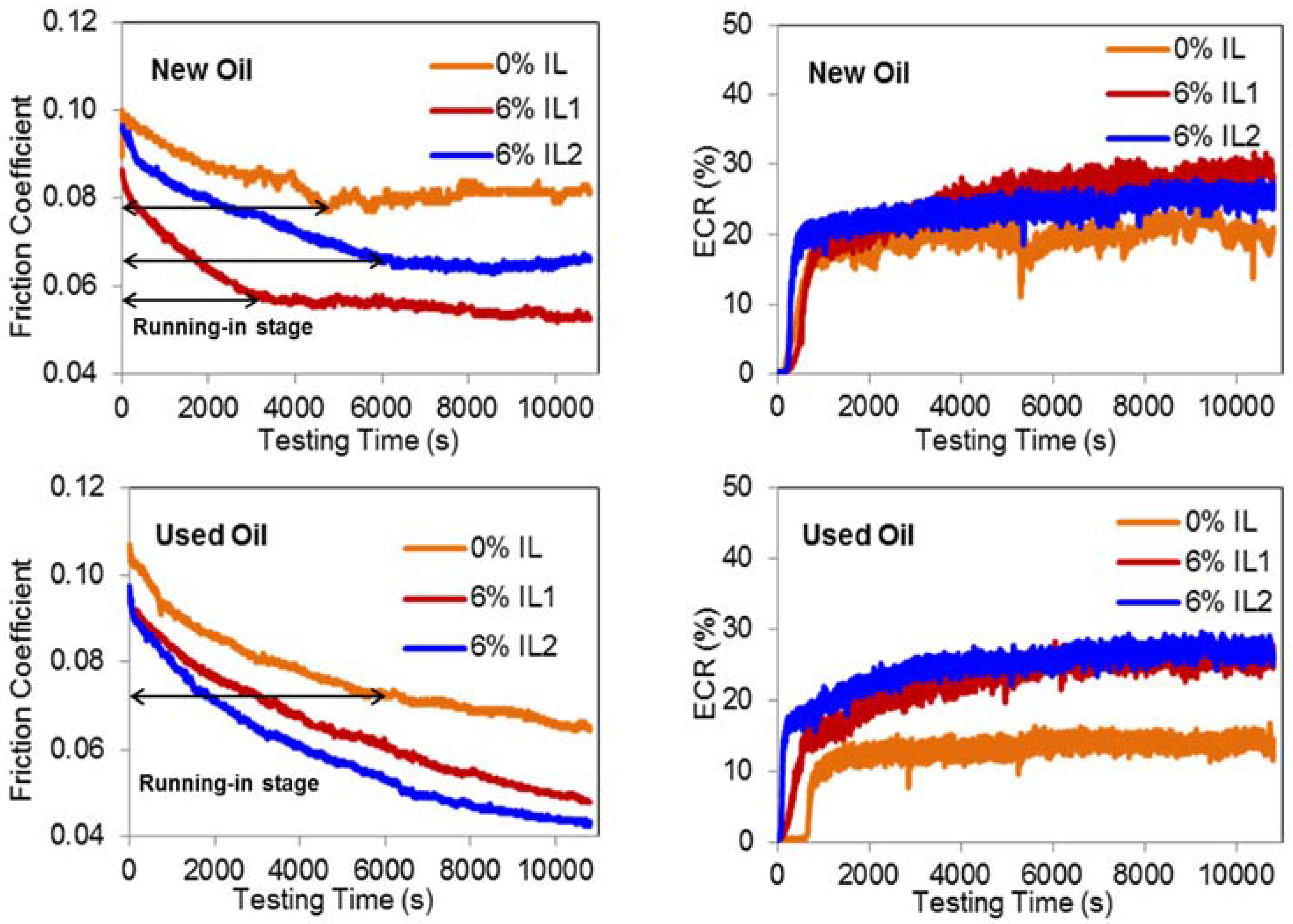 In the case of Used Oil, in Figure 3, the steady-state friction was reached at 6200 s, but was only short-lived until 9000 s, after which time the friction coefficient dropped again. Addition of both ILs improved the friction performance of Used Oil, but showed no distinction in the overall trend. The friction coefficient dropped continuously in a quasi-linear manner from the beginning of tribo-test. This phenomenon was ascribed to the fact that various processes begin to operate during the running-in stage. The superposition of their influence leads to complex frictional changes until a balance (or equilibrium) is achieved, but sometimes these processes continue to evolve and steady-state is either not achieved or short-lived [25]. Unlike New Oil, IL2 additive showed lower friction and formed a thicker film than IL1 in Used Oil. Furthermore, Figure 4 shows that, after the addition of ILs, the induction time for Used Oil was reduced from 646 to 100 and 64 s for IL1 and IL2, respectively. Additionally, the time to reach stable boundary film for Used Oil also reduced from 755 to 550 and 150 s by addition of IL1, and IL2, respectively. These results clearly showed that the boundary film formation process initiated much earlier in case of IL2 than IL1, followed by pure Used Oil.