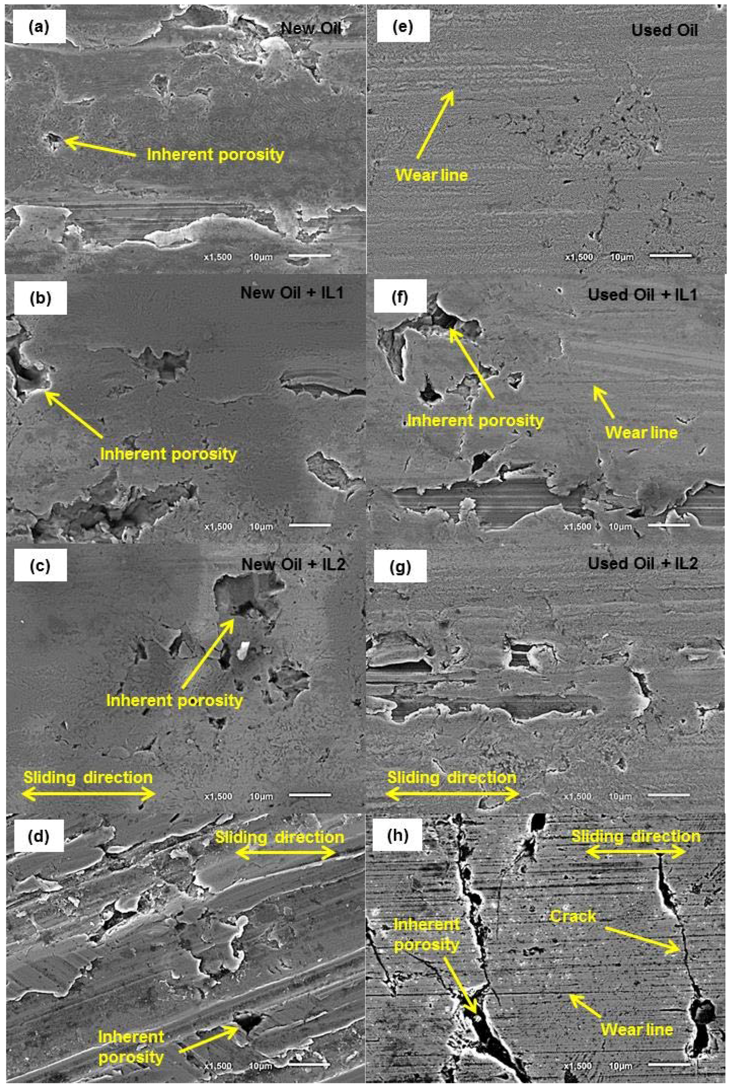 SEM images (×1500) of flat coupons lubricated with New Oil (with/without ILs) in (a–c) and Used Oil (with/without ILs) in (e–g). SEM images (×1500) of actual cylinder liner surface near TDC (d) unworn cross hatched surface of new liner; (h) worn surface of used liner at end of its service life.