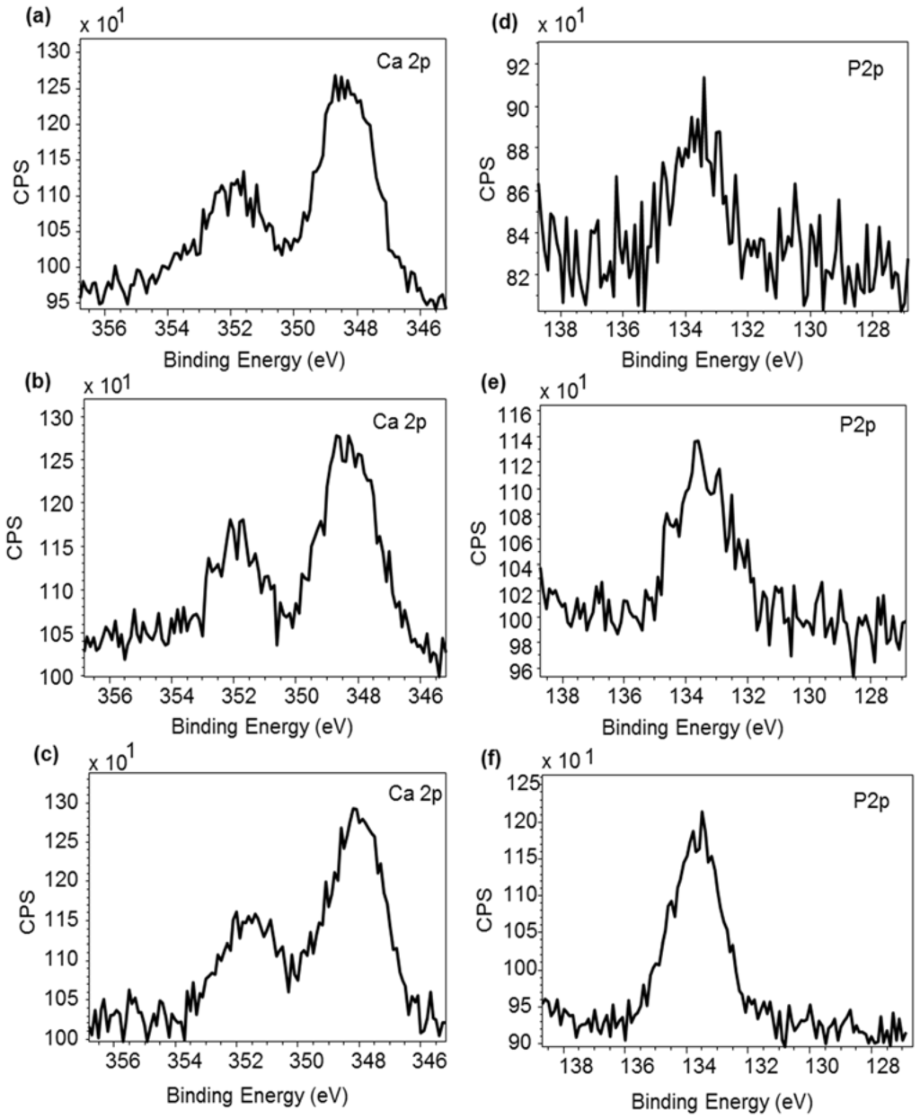 Furthermore, Figure 6 shows the presence of Calcium Phosphate, Ca3(PO4)2, in the surface films formed by Used Oil, both with/without ILs. In addition, an increase in the intensity of the P2p band reflects the higher concentration of phosphorus after the addition of IL1 (Figure 6e) and IL2 (Figure 6f), compared to that of Used Oil without ILs (Figure 6d). These results also support the EDX observations mentioned in Table 5, and indicate the involvement of phosphorus-containing ILs in the process of boundary film formation.