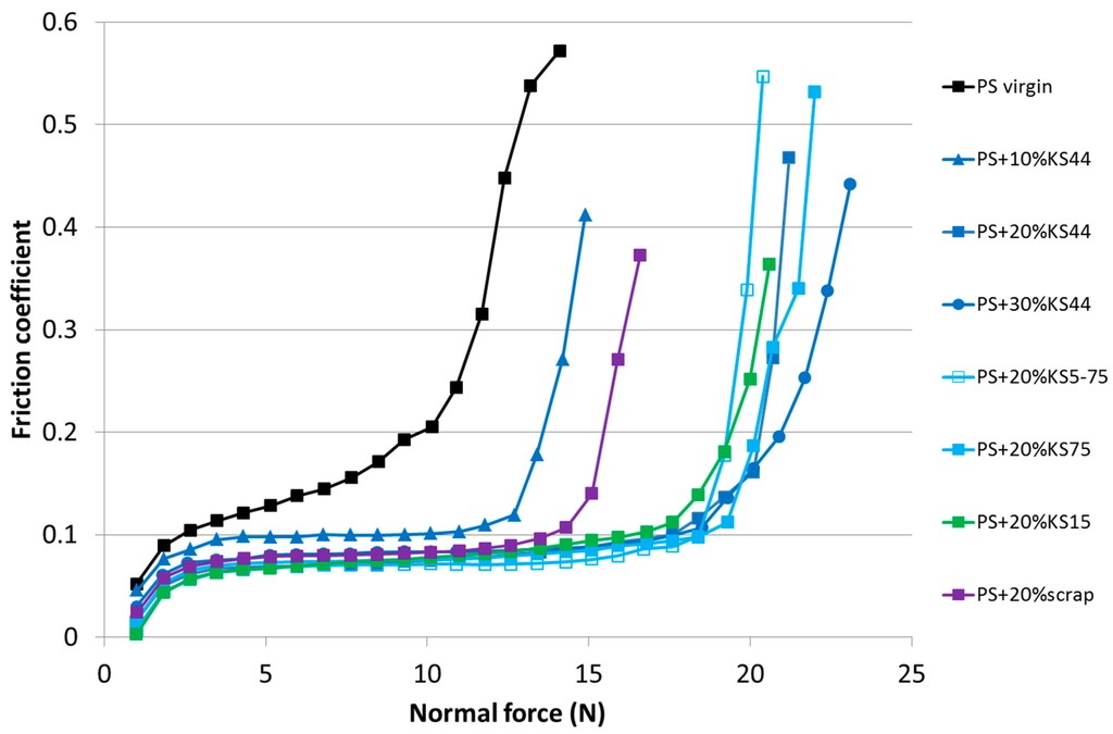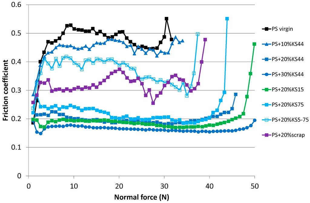 In Figure 4, the results from tribological tests are shown with the PA66 ball rotating on graphite-filled PS plates at a constant speed (500 rpm corresponding to 0.235 m/s) and varying normal force. By changing the ball material from metal (steel) to plastic (PA66), there is a dramatic change in the test results. Unfilled PS can withstand higher forces against PA66 compared to steel and only after the limiting force of 10 N, there is a sharp increase in friction coefficient.