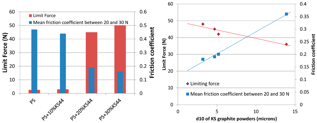 Comparing the same graphite type (KS) with a different particle size distribution (PSD) at the same loading (20%), we can observe that fine graphite particles are very important in order to improve the friction coefficient and PV limit of PS against steel. In fact, KS5-75 with a low amount of fines (d10 = 14 microns) has a low limiting force and a high friction coefficient (only slightly better than virgin PS), whereas KS15 (d90 = 17 microns) has a low friction coefficient and a high limiting force. KS44 and KS75 give intermediate performance, as shown in Figure 2 (right). This effect might be explained by the fact that fine graphite is able to form a better transfer film between the PS plate and steel ball.