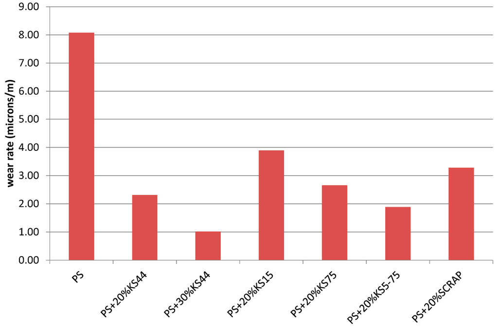 Wear tests were performed at a constant force (30 N) and a constant speed (500 rpm). The friction coefficient and wear rate were measured for all the compounds apart from the one with 10% KS10. As shown in Figure 3, the wear rate of virgin PS is very high (due to the high friction coefficient). Surprisingly, the wear rate for the fine graphite (KS15) was higher than that for the coarse graphite (KS5-75) despite the lower friction coefficient and higher PV limit (see Figure 1). A possible explanation is that fine graphite can more easily wear out from the PS compound and therefore create a good tribofilm that gives a low friction coefficient and a high limiting force. On the other hand, coarse graphite is probably more difficult to detach from the polymer compound (which is good for a high wear resistance) and cannot create a nice tribofilm on steel (which is bad for the friction coefficient and limiting force). KS44 and KS75 have wear rates between KS5-75 and KS15 (which is consistent with our explanation), whereas the SCRAP graphite has a slightly higher wear rate than KS75, probably due to the lower degree of crystallinity.