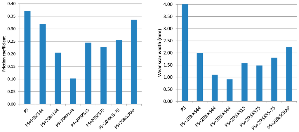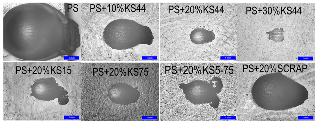 As expected, samples with a higher final friction coefficient have larger wear scars. In the case of unfilled PS, the wear scar is extremely large, and we could observe molten polymer transported from the ball on the side of the wear scar. This means that, during the wear test, local temperatures >200 °C had been reached. The wear scar size was strongly reduced as the amount of KS44 increased. At a 20% loading level, SCRAP graphite leads to larger wear scars compared to KS graphite.