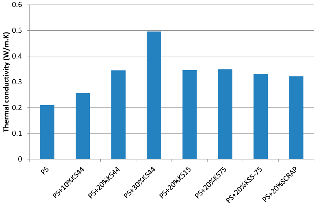 Polystyrene (EMPERA 124 N) was mixed with graphite for 5 min at 220 °C and 100 rpm. 100 × 100 × 4 mm3 plates were prepared by compression molding using a LabTech Scientific LP-S-20 press. Samples for tribology tests (14 × 6 × 4 mm3) and discs for thermal conductivity measurements were cut using a CNC machine.