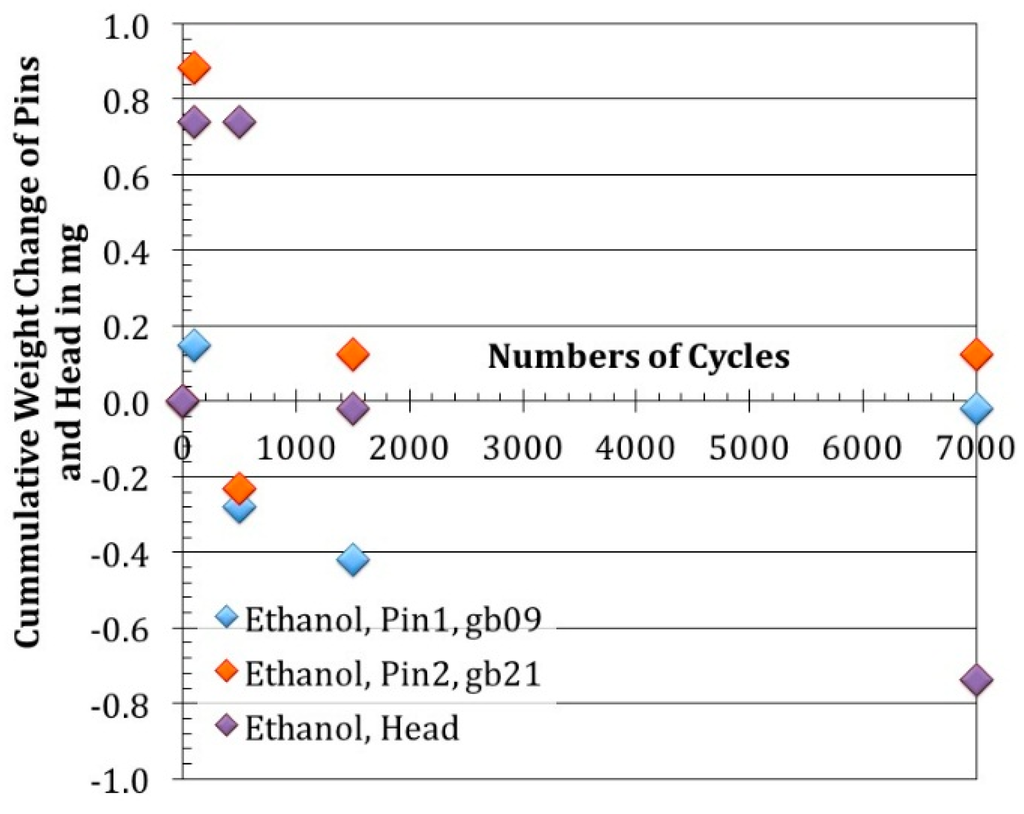 The total material loss of pins and heads gained from weight loss measurements are comparatively shown in Figure 3 for both cleaning procedures. Clearly, there are marked differences as to the weight changes of the pins while the heads show a similar behavior. A simple linear regression for the heads shows that they have about the same average wear rate over the entire test period of 8 mg/100,000 cycles (R2 = 0.99).