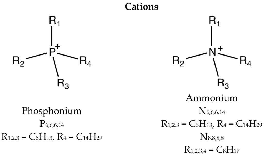 The structures of the cations and anions investigated in this work are shown in Figure 4. The tested ILs, comprising of these cations and anions, are shown in Table 1. The synthesis and characterization of (P6,6,6,14)(BEHP) is detailed in Sun et al. [19], while synthesis of (P6,6,6,14)(SSi) is detailed in Somers et al. [9]. The quaternary ammonium salts were prepared in our laboratory using the following procedure: Tetraoctylammonium bromide (98%), Tetradecyltrihexylammonium bromide (≥97.0%) and bis(2-ethylhexyl)phosphoric acid (97%) were purchased from Sigma Aldrich (Castle Hill, Australia) and used without further purification. Deionized water (18 MΩ·cm−1) was used throughout our experiments. Bromide content was determined by an ionode IJ-Br bromide selective electrode after calibration with 10 and 100 ppm bromide solutions.
