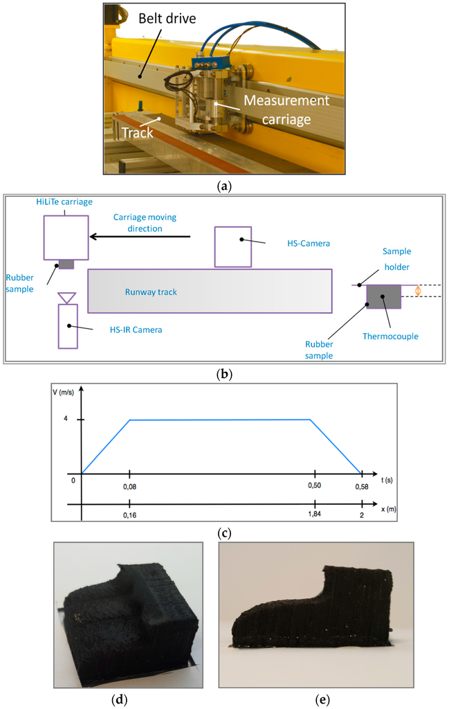 (a) High Speed Linear Tester (HiLiTe); (b) test set-up for contact temperature and deformation measurements; (c) test phases; (d,e) final sample shape after sliding phase on concrete test track.