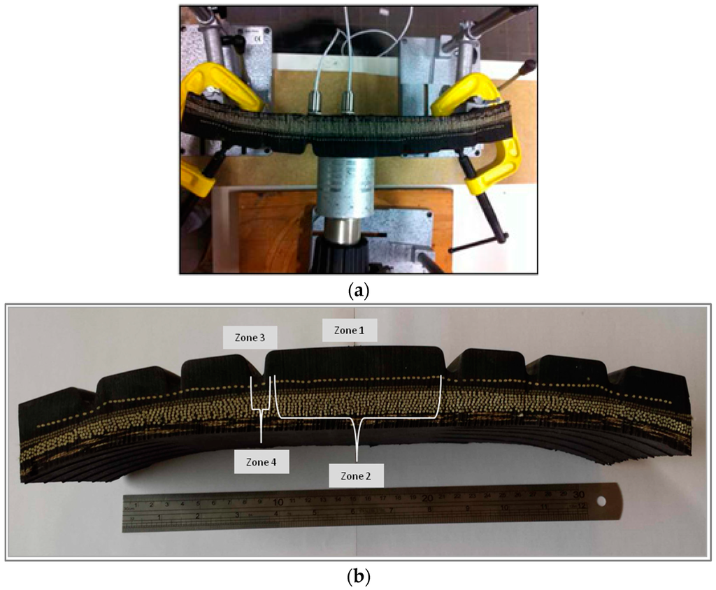 The main objective of this test is to determine the temperature evolution of the tire tread, by means of a simple temperature increase experiment. Here the frictional heating of the tire tread is replaced by an external heat source, after which the thermal diffusion throughout the tire cross-section is measured. The experimental test consists of increasing the temperature of the tire tread over a fixed time, using a heat source (Figure 3b, zone 1) at a pre-determined temperature. The temperature evolution was measured simultaneously, at the outer surfaces ((zones 1, 3), Figure 3b), using two external sensors facing the tire tread (zone 1) and the groove (zone 3). The thermal evolution inside the tire structure was also recorded ((zones 2, 4), Figure 3b) by means of an additional two infrared sensors (Figure 3a, top). The heat flow is vertical to the tire tread surface.