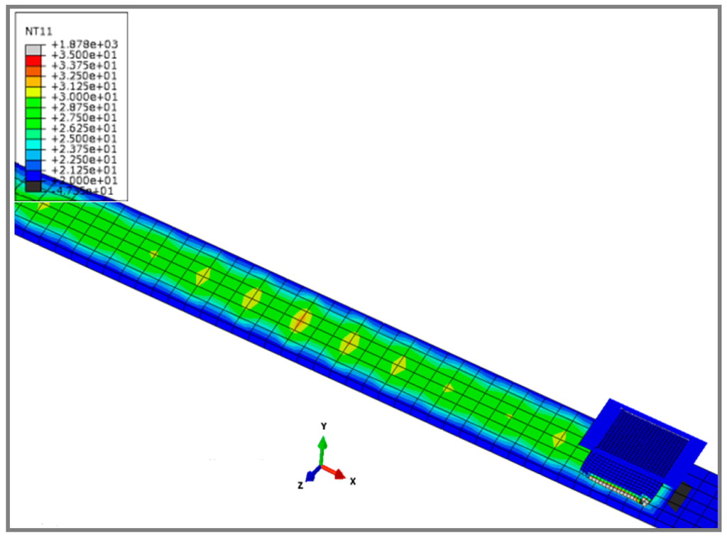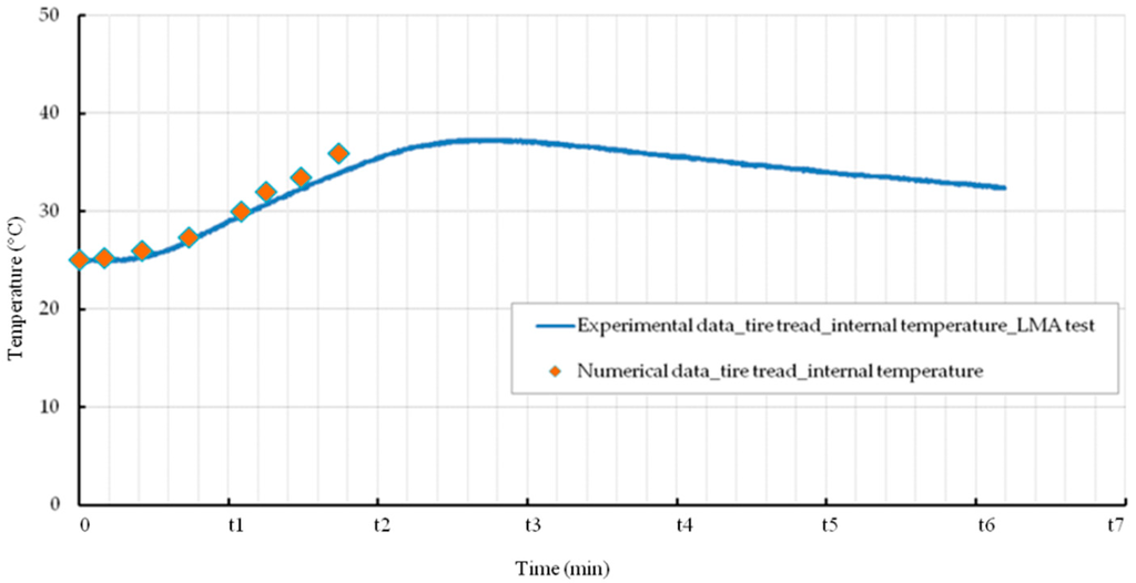 Figure 5 illustrates a comparison between the experimental measurements and the simulated temperature evolution of the tire tread rubber (zone (2), Figure 3b) for an equivalent external heat source. The numerical simulation was carried out using a numerical specimen identical to the physical specimen.