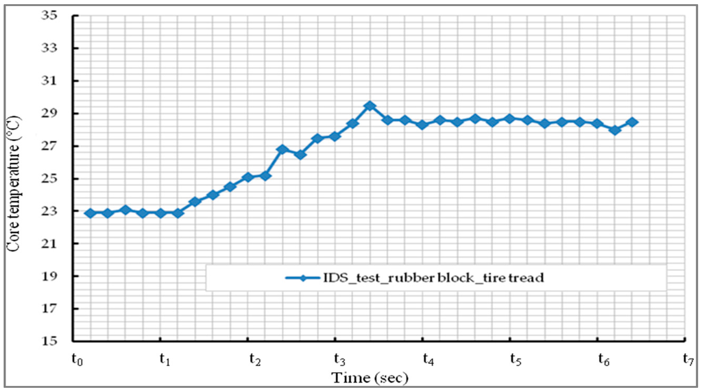 A good correlation is obtained between the simulated temperature of the tire tread and that actually measured. Figure 6 presents the internal thermal evolution of the rubber block observed during sliding (IDS test, Figure 2b). As can be observed, the core temperature increases during the first instants of sliding; a plateau is rapidly attended. It can be concluded that the temperature increase of rubber produced by sliding on a rough surface, or by heat diffusion, leads to a similar evolution in the tire tread rubber (Figure 5 and Figure 6). Whatever the mechanism of heating, by friction or by heat diffusion, the thermal evolution of the rubber remains identical.