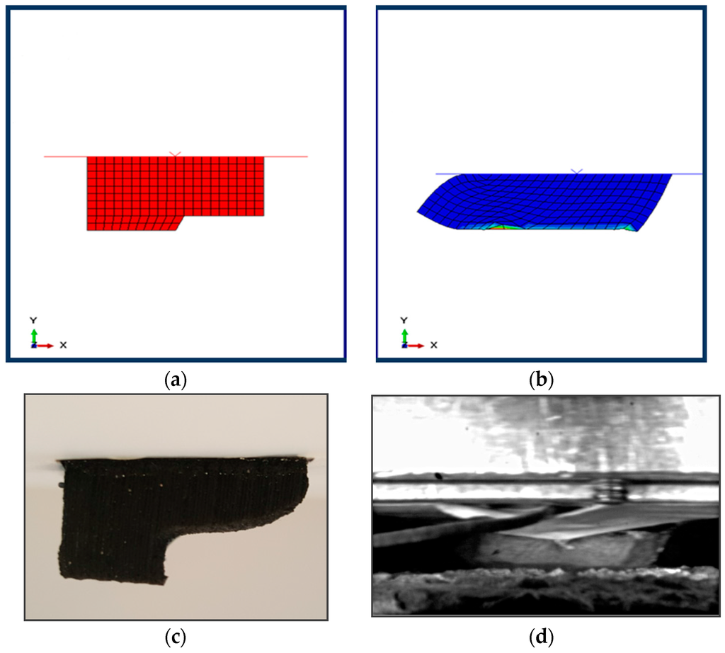 Figure 8a presents a full 2D image of the eroded initial shape of the rubber sample corresponding to the experimental specimen (Figure 8c). Figure 8b shows the numerical results with respect to the same rubber sample, while taking into account the final eroded shape of the specimen by means of an “eroded initial shape”. In this case, the rubber block is loaded with 2.5 MPa and sliding at 4 m/s. This deformed shape is in good correlation with the rubber block tested using the Hannover facility (Figure 8d).
