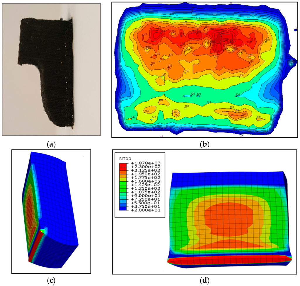 (a) Experimental specimen, a rubber sample shape after the sliding step; (b) experimental measurement, thermal evolution of a rubber sample/contact zone at the end of the sliding step (in °C); (c) numerical specimen, rubber sample shape after first sliding; (d) numerical simulation typical lateral view of the deformed specimen’s final shape appearance, thermal evolution in the contact zone, the temperatures are presented in °C (NT11).