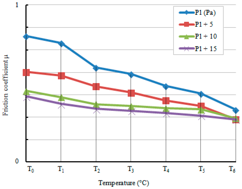 IDS experimental results, variation of friction coefficient as function of the ambient temperature of the test track, for different given contact pressures.