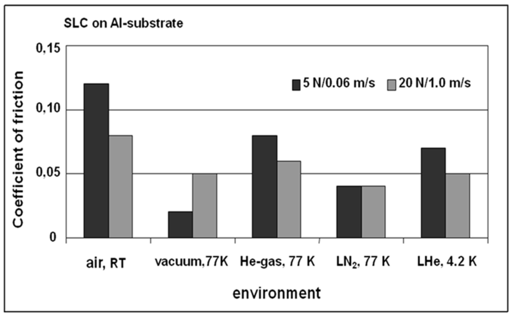 Many AF coatings need a certain running in for achieving the desired properties. One extreme case is shown in Figure 1. It is a sprayed MoS2 coating with polycarbamide binder, which was specially designed for space applications []. Figure 1a shows a scanning electron microscopy (SEM) image of the virgin coating, which consists of only loosely adhered particles. During loading and sliding the particles are compacted and get a preferred order, resulting in a very smooth film (Figure 1b). In Figure 2, the friction coefficients of this coating against 100Cr6 steel balls (AISI 52100) are shown for several cryogenic environments []. It can be seen that it provides effective lubrication in all of the investigated media. In cryogenic environment, friction is considerable lower than at room temperature. The lowest friction coefficient is 0.02 at 77 K in vacuum. In most cases, higher loads and velocities give lower friction, which is a common feature of MoS2 coatings.