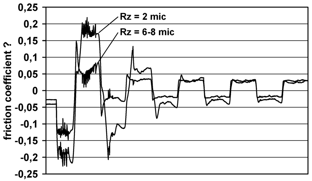 First friction cycles of a sputtered MoS2 coating against Al-bronze in LHe environment; two samples with different substrate roughness; load: 250 N; average sliding velocity: 0.2 mm·s−1 (negative values indicate the reciprocating motion) [].