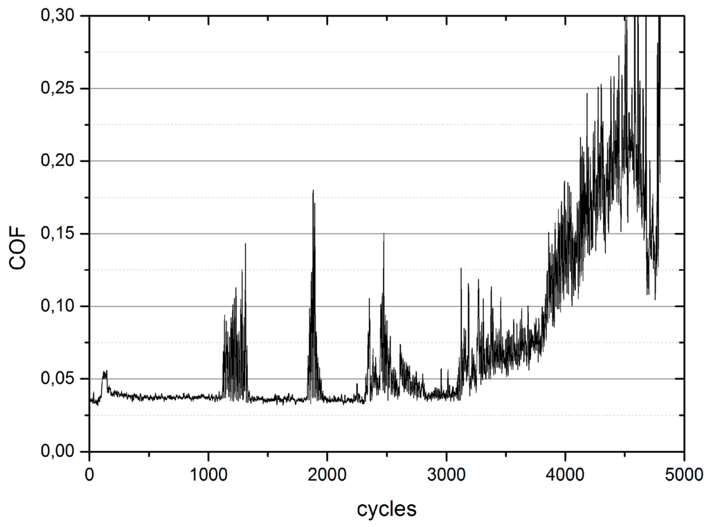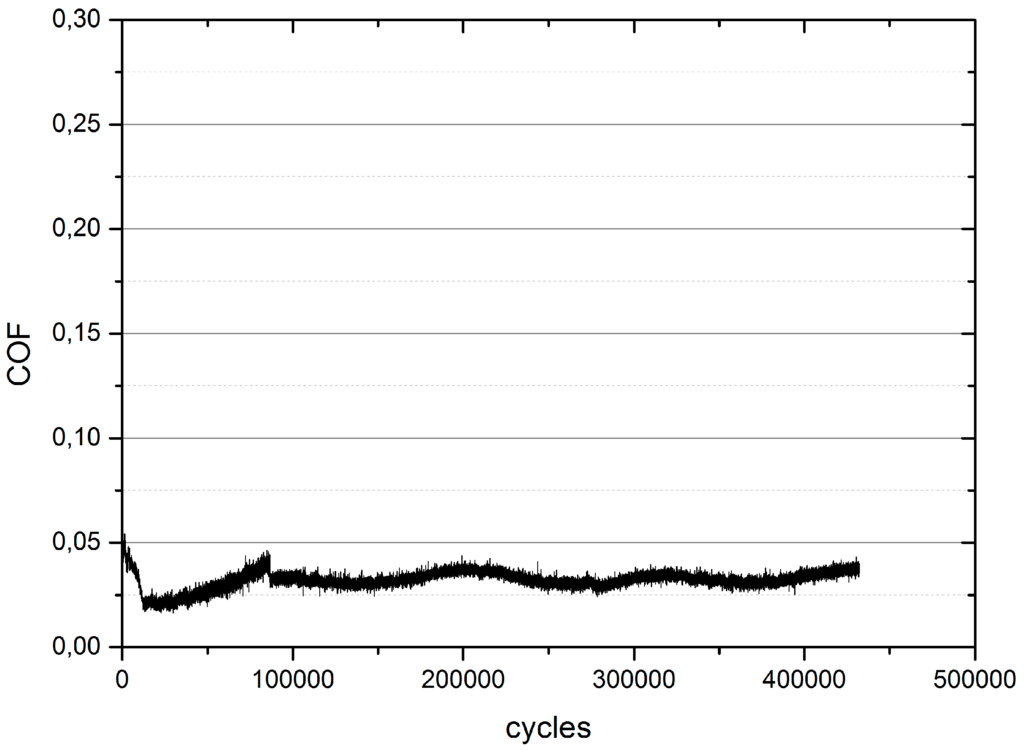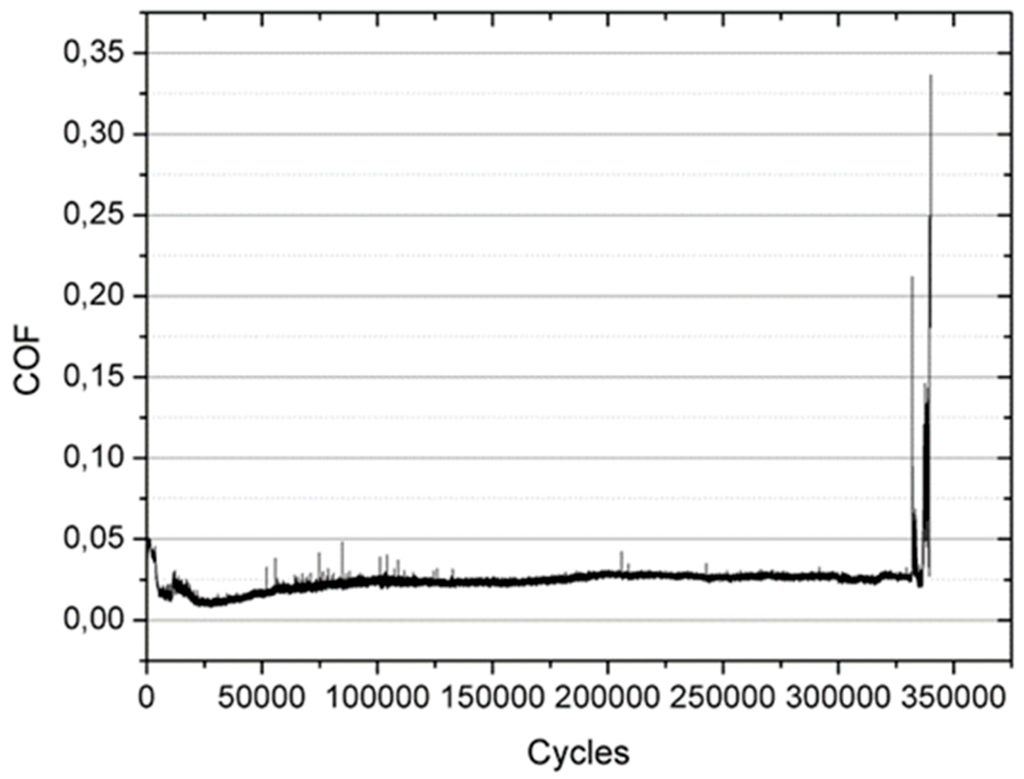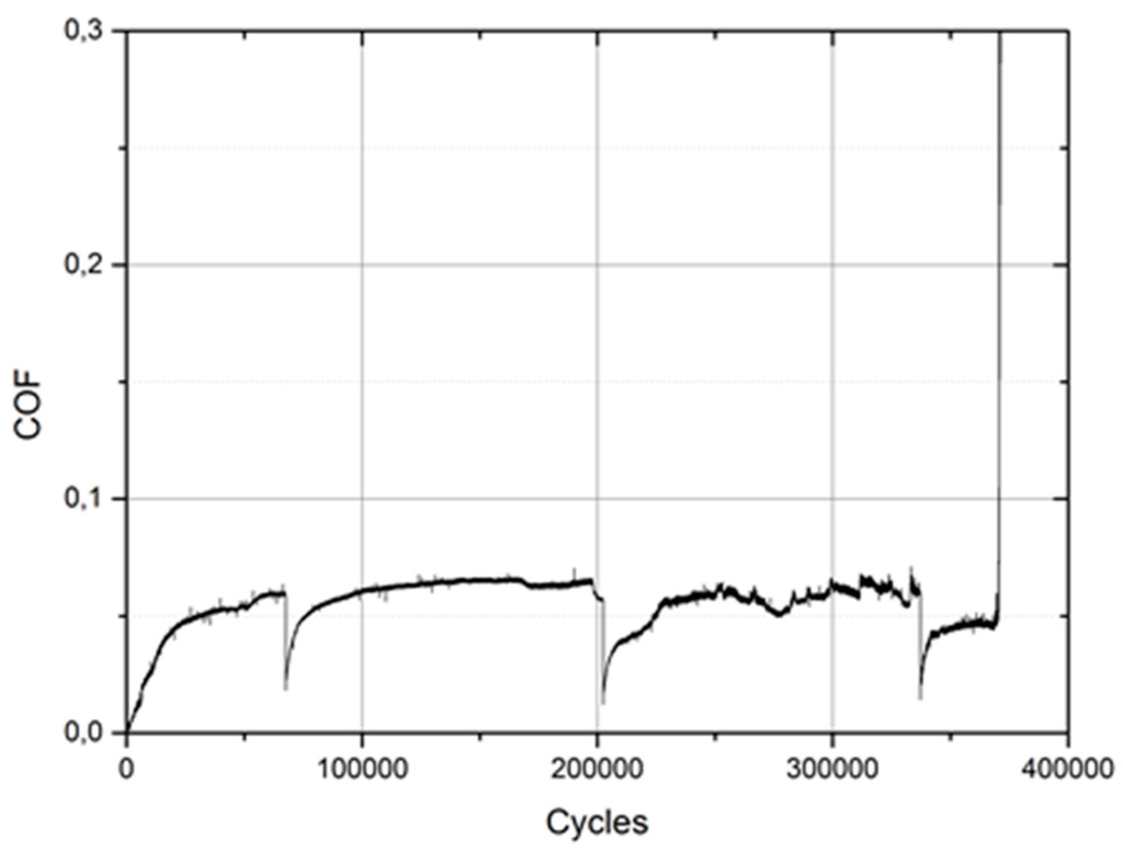 Under vacuum conditions all variants showed friction coefficients below 0.1 and wear coefficients in the range of 1 to 3 × 10−7 mm3·N−1·m−1. As an example, Figure 5 shows a friction plot for a PVD-MoS2 coating in high vacuum. The coating is similar to the one used in the Wendelstein 7-X fusion experiment []. The peaks to negative direction are caused by test stops and restarts. It can be seen that the friction coefficient is around 0.06 and the wear life more than 350,000 cycles.