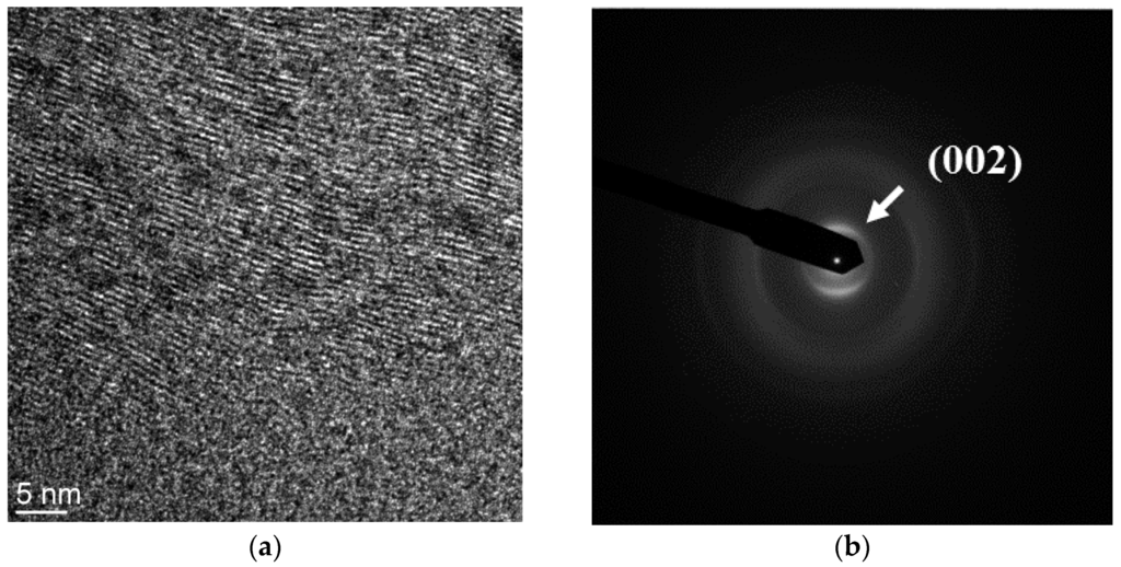 (a) High resolution transmission electron microscopy (HR-TEM) and (b) selected area diffraction (SAED) images of a MoS2 coating with higher internal stress.