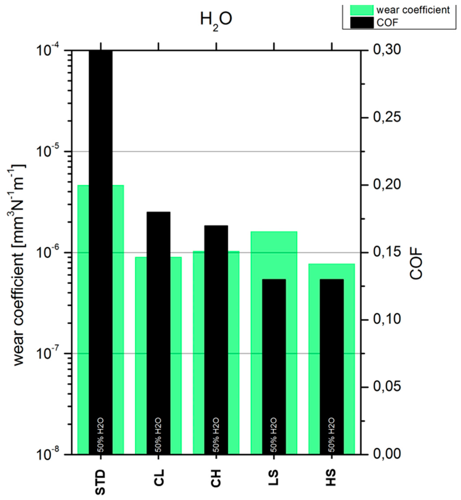 Figure 10 shows the friction and wear data for all five variants in water vapor. The friction coefficients of the pure LS and HS coatings are about 0.13 and 0.17, respectively, for the Cr containing variants. For all optimized coatings, the wear coefficients are in the order of 10−6 mm3·N−1·m−1. For the standard coating both, friction and wear are cosiderably higher. This proves the lower sensitivity to humidity of these variants.