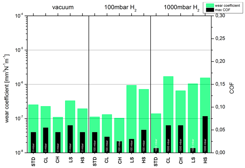 Figure 13 shows a comparison of the friction and wear behavior between high and low pressure hydrogen and vacuum environment for the four variants. Between vacuum and low pressure hydrogen, the differences are small. Only the pure coatings with optimized structure showed higher wear. In hydrogen gas at normal pressure all variants showed higher wear with the exception of the standard coating, which showed a similar wear rate and distinctively lower friction than in vacuum. In addition, the friction of the pure variant with lower intrinsic stress was as low as for the standard variant. However, these results are based on only two tests for each condition. Therefore, only the general tendency to low friction and wear in hydrogen environment is verified. The pressure dependence is less clear and needs to be proved by further tests.