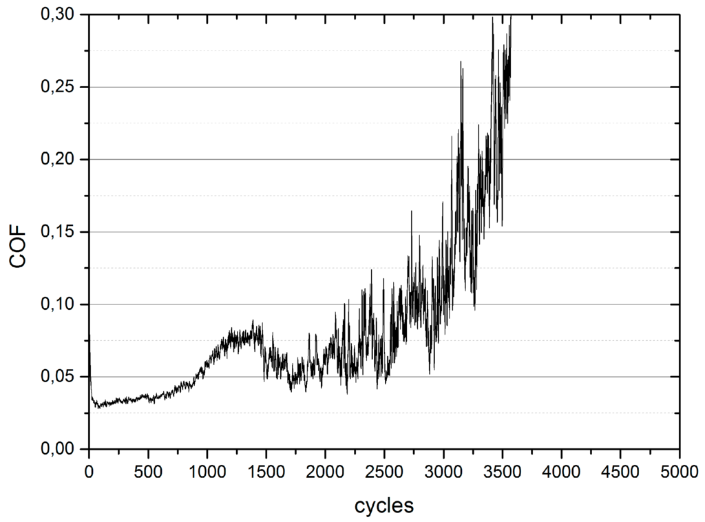 Coefficient of friction of a PVD-MoS2 coating [] under high vacuum conditions (residual pressure: 2 × 10−5 mbar); counterbody: 10-mm 100Cr6 ball, load: 40 N; sliding velocity: 0.5 ms−1.