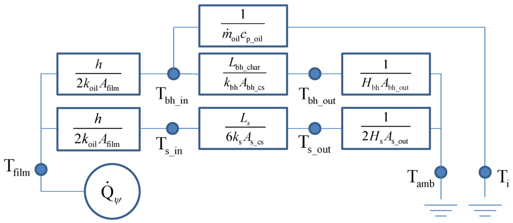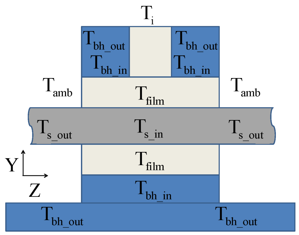 - the extension of the thermal model to include the heating of the shaft, the bearing housing and the oil in the inlet channel, as depicted in Figure 4. Especially the effect of heating the oil in the inlet channel inside the bearing housing just upstream the bearing was found to be having a major impact on the effective film temperature.