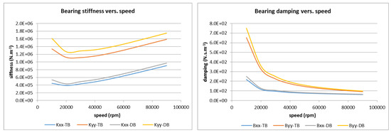 Dynamic characteristics of the bearings used in ACM, calculated by the method described in Section 4, are presented in Figure 2. Bearings 25 mm in diameter with l/D ratio of 0.72 were loaded with 4.4 N at the turbine (TB) and 4.9 N at the blower (DB) side, respectively.