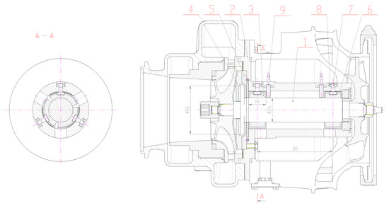 An ACM with aerodynamic TPJBs, designed in 2012 [12], is shown in Figure 3. The rotor 1 is supported by two TPJBs with elastically supported pads 3. Axial forces are taken up by aerodynamic spiral groove thrust bearings 4, 5. Turbine (left) and blower (right) impellers are at rotor overhang ends. Rotor relative vibrations are observed by two pairs of eddy current sensors 9, which have measuring range of 0.5 mm and typical sensitivity of 28 mV/µm.
