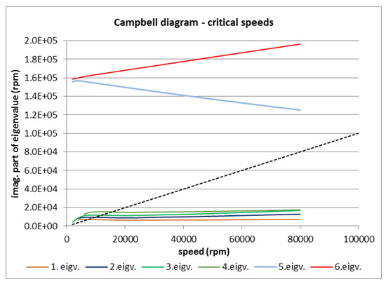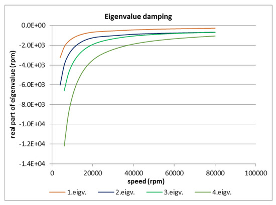 As can be seen in Figure 5, real parts of the four relevant eigenvalues are negative, so that the rotor operation is stable. Rotor resistance to instability is usually determined by means of logarithmic decrement, designated as log δ, defined e.g., in [13]. However, to make the situation more obvious, we can define the stability reserve of the rotor as a percentage by the following equation: